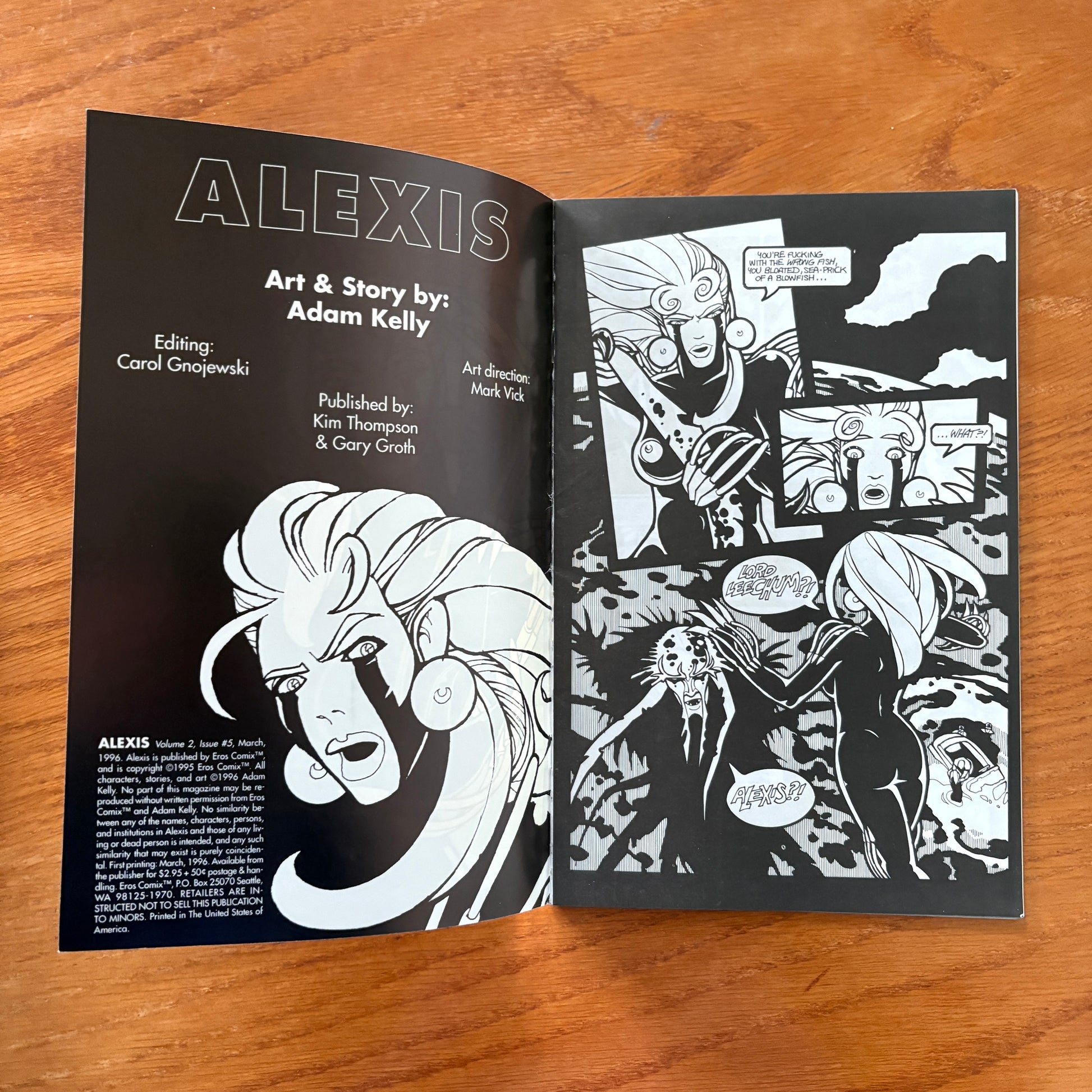 The final issue of the Alexis series, this volume concludes the adult-themed sci-fi saga with a blend of eroticism and speculative fiction. Written and illustrated by Adam Kelly, it delivers a mature narrative that explores complex themes within a futuristic setting. As part of Fantagraphics' Eros Comix imprint, this issue is a notable example of 1990s underground adult comics.