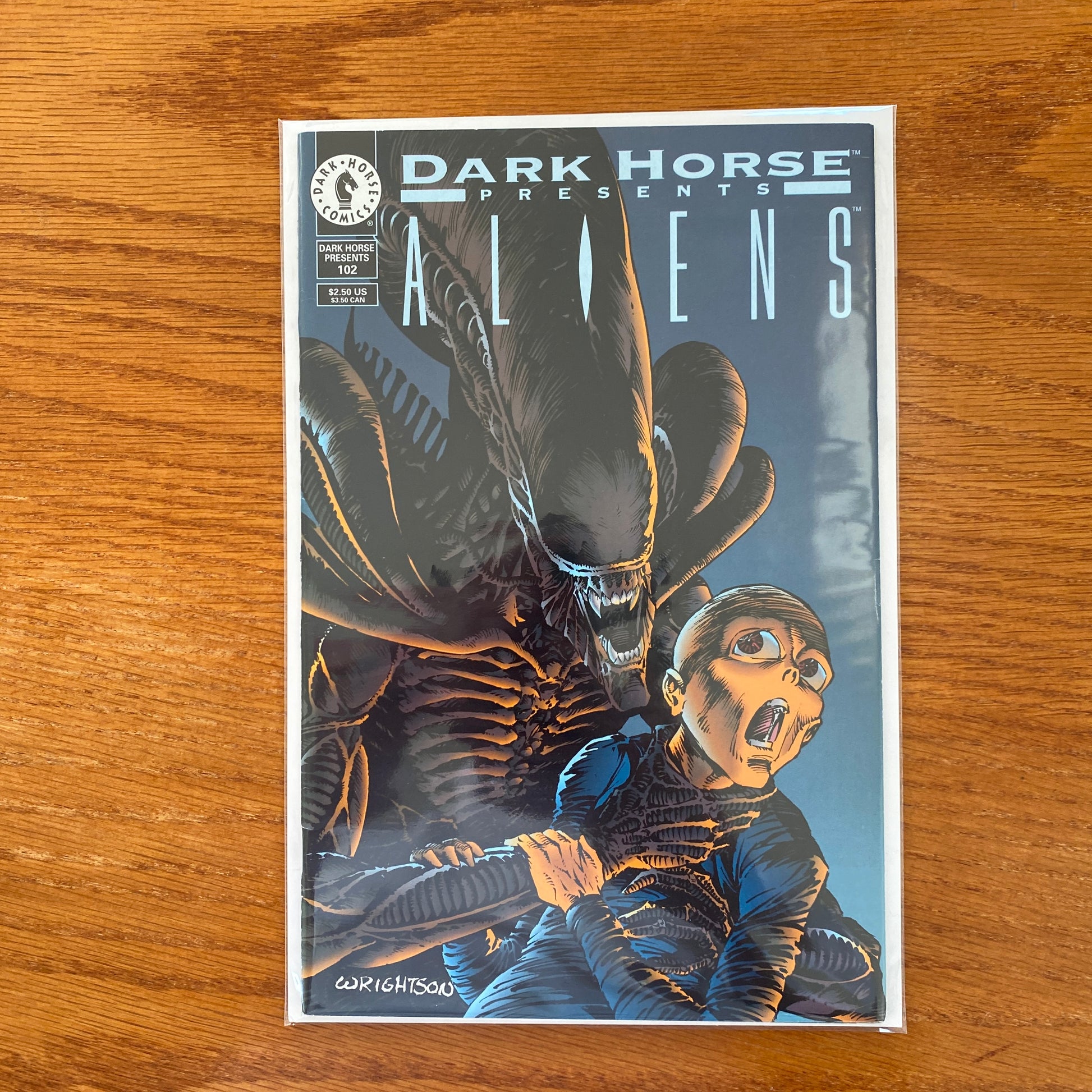 Cover by Bernie Wrightson. In this conclusion to the "Aliens" story, the extraterrestrial scientists from last issue become fodder for the big bug, and their ship crashes into an earth jungle. Notables Bernie Wrightson and Ron Marz turn in a fast-moving, suspenseful, and beautifully rendered tale of everyone's favorite exoskeletal carnivores. "Mr. Painter" is the story of a disaffected artiste, Alan Bland -- a coffee addict and tuba aficionado -- who becomes obsessed with an old painting he finds in his parents' home. "The One Trick Rip-off" is a stylish, comics noir strip set in a near-future L.A. and focuses on a small group of thieves called the One Tricks. Paul Pope follows up on his Eisner-nominated THB with the second chapter of this twelve-part thriller. "Cal: Hairball" is a mystery featuring Cal McDonald, paranormal investigator, whose pursuit of some weird characters puts him on the trail of a murderer. And in "Sun Ra," Pekar and Sacco give a biographical profile on the band leader who first incorporated electric instruments with percussion and wind instruments to mix traditional African music with modern jazz. B&W