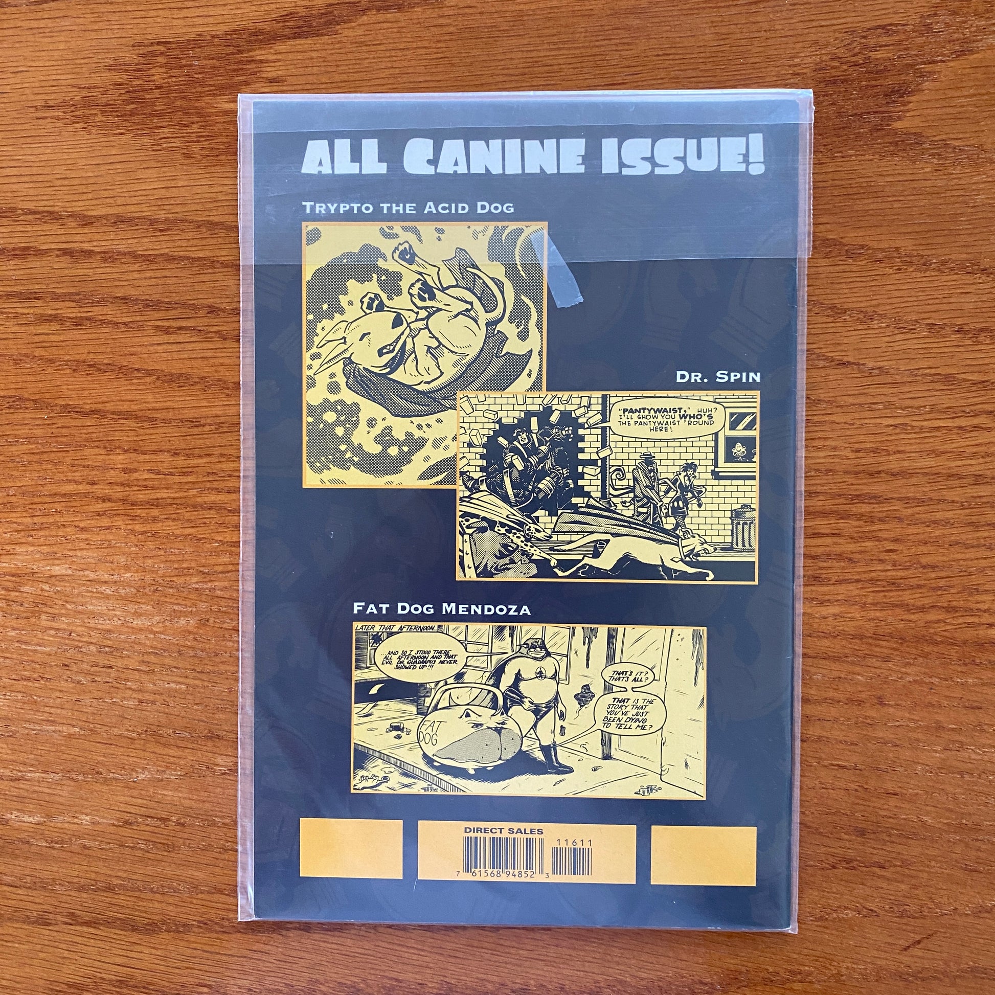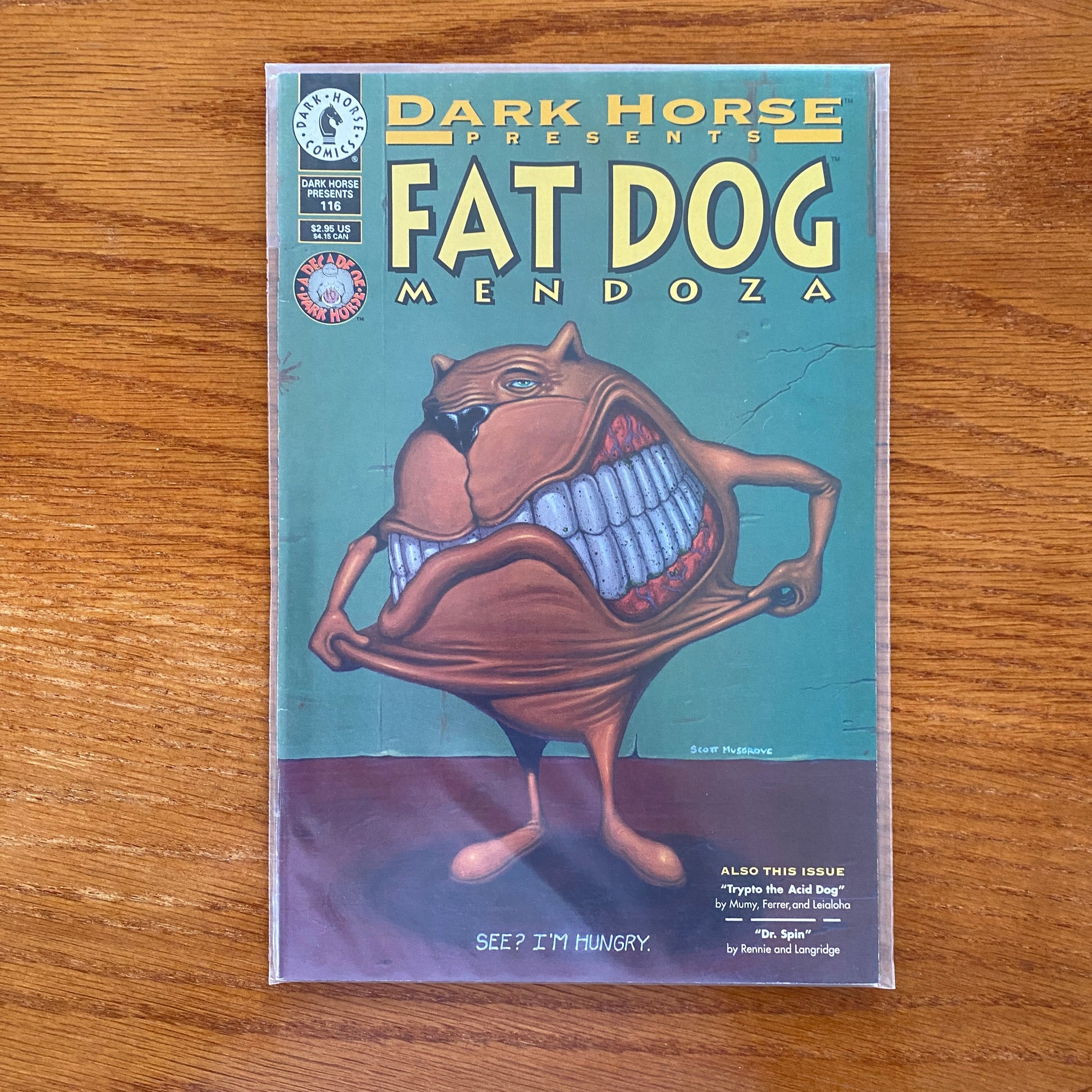 Cover by Scott Musgrove. DHP continues in its mission of bringing in the greatest talent and the most original stories! Hilarious tales let the hot air out of the superhero genre! In Gordon Rennie and Roger Langridge's "Dr. Spin," the intrepid Master of the Improbable is called out of his retirement to battle the chaos that is destroying comic-book continuity everywhere! Bill Mumy, Miguel Ferrer, and Steve Leialoha give us "Trypto the Acid Dog." Trypto is "Lost in Space," and has a close encounter with some curious aliens. Unfortunately for them, Trypto isn't like other dogs! Of course, neither is "Fat Dog Mendoza," Scott Musgrove's superhero supreme. Fat Dog and The Whoosh are trying to get away for the weekend, but they discover that wherever you go, there'll always be sheep. This issue features an all-new Fat Dog cover by Mr. Musgrove himself! B&W.