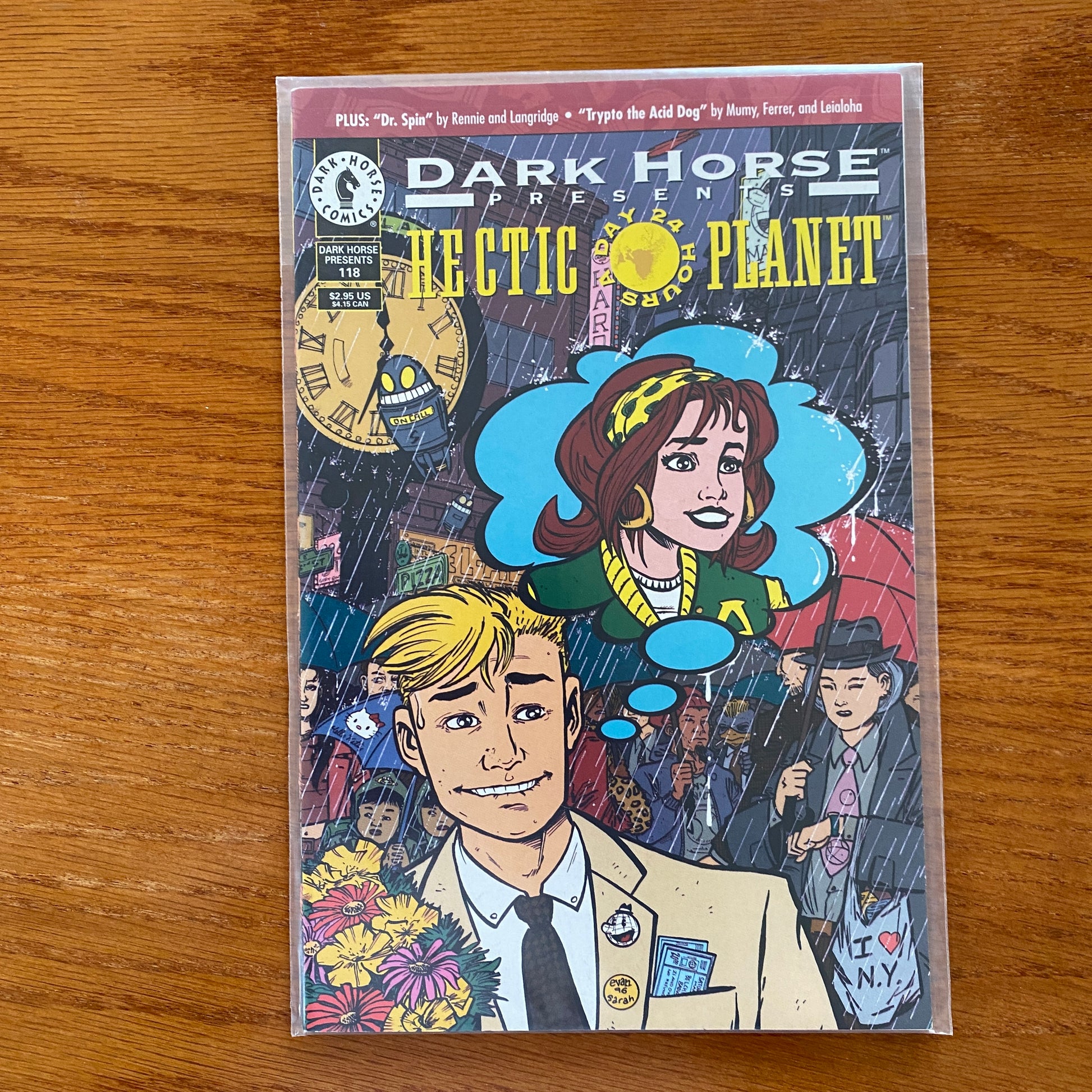 Cover by Arthur Adams and Evan Dorkin. Monkeyman and O'Brien make their return to these pages with an all-new serial by Legend cartoonist Arthur Adams! Our daring duo butts heads with Gorhemoth, the living garbage heap. Meanwhile, the only monster on Evan Dorkin's "Hectic Planet" is that twisted creature called love, and Halby is suffering at its hands! In the final chapter of "Trypto the Acid Dog" by Bill Mumy, Miguel Ferrer, and Steve Leialoha, the faithful canine saves his boy and family from the hands of evil; and in their last chapter, Dr. Spin and Spin Girl save comic books as we know them, ensuring future employment for their creators, Gordon Rennie and Roger Langridge. B&W.
