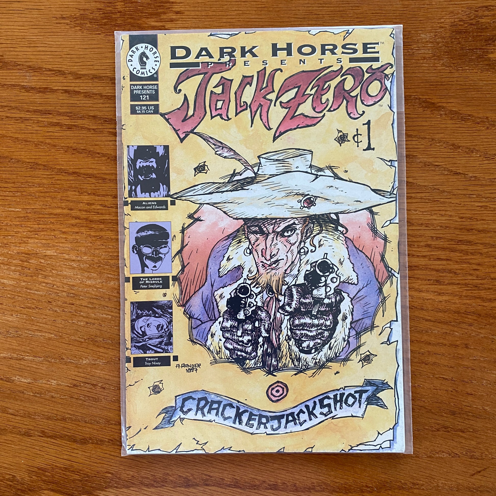 Cover by Arnold Pander. Jack Zero is a legendary gunslinger immortalized in pulp magazines, but when he tells the story himself, it's clear that the truth is a lot different than the fiction that was made out of it. European performance artist Zero Boy and Eisner Award winning artist Arnold Pander (Triple*X, Rune, Grendel) collaborate on the five-part series "Jack Zero," which begins here. Meanwhile, writer Darko Macan (Star Wars: X-Wing Rogue Squadron, Grendel Tales: Devils and Deaths) and artist Tommy Lee Edwards (Helix's Gemini Blood, Batman Chronicles) craft an eerie short story of Aliens, where the only things that are clearly black-and-white are the ink and the paper. In "Aliens: Borderlines," a soldier on a far outpost learns what it's like to live in the sort of fear armies inspire. He's come face to face with an Alien, and he's not sure how literal a face-to-face meeting it was. And for those who are already along for the ride, we have the next installments of "The Lords of Misrule," by John Tomlinson and Peter Snejbjerg (The Dreaming), and "Trout," by Troy Nixey. B&W.
