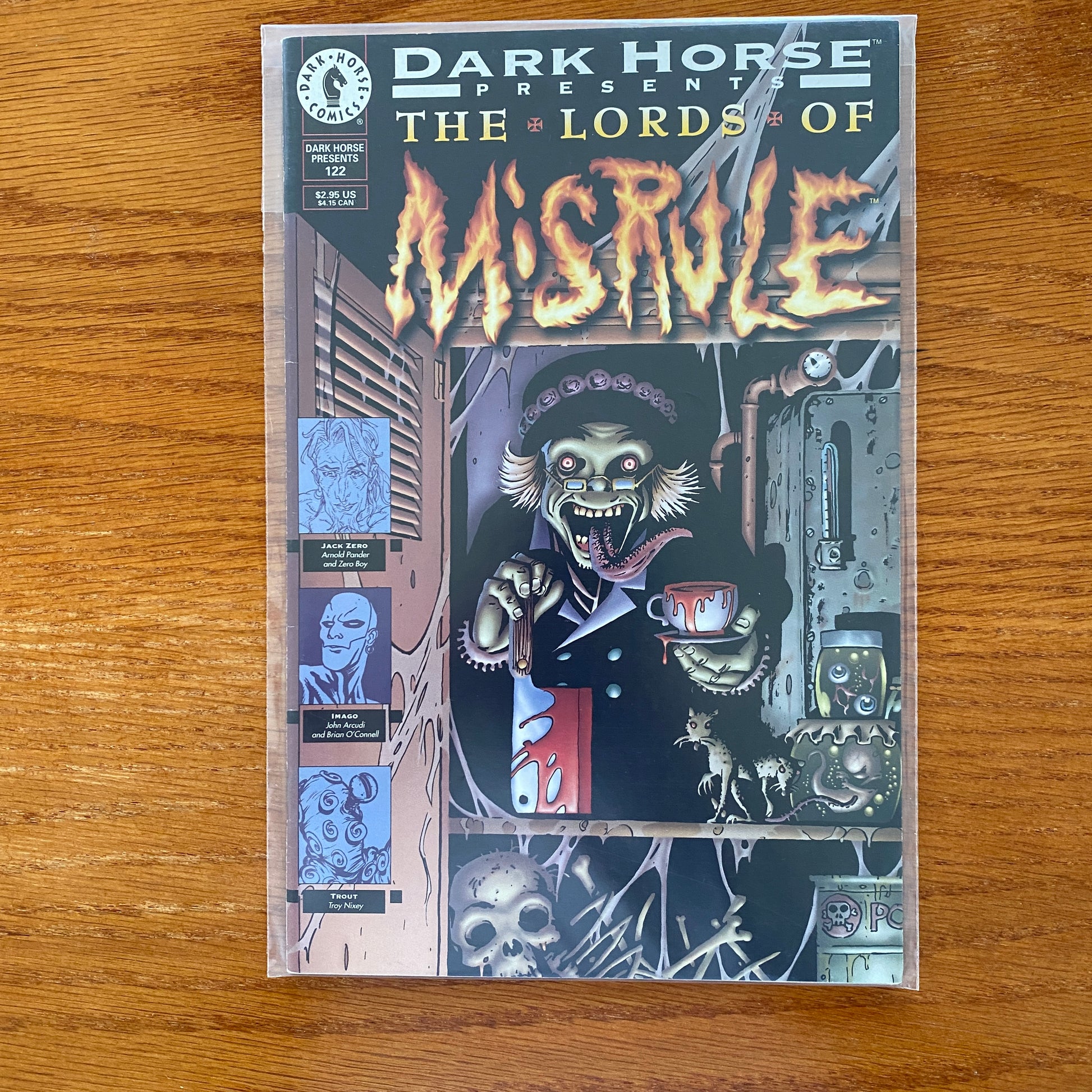 Cover by Peter Snejbjerg . Old ladies with sharp objects are bad, especially in the world of The Lords of Misrule. Urban legends become real nightmares, courtesy of John Tomlinson and Peter Snejbjerg (who provides this issue's gruesome cover). Speaking of bad dreams, Trout's has gotten free, and he's just about to catch up with it. But what happens when you look in the face of your own terror? "Trout" is by Canadian artist Troy Nixey (Bill the Clown). "Jack Zero," the new strip by Arnold Pander (Triple*X, Rune) and European performance artist Zero Boy continues as Jack meets Buffalo Bill, Wild Bill Hickock, Annie Oakley, and the love of his life, Rose Barclay. Hanging with these dangerous folk starts the Jack Zero legend, the stuff pulps are made of. Finally, in the first part of "Imago," writer John Arcudi (Lobo/Mask) and artist Brian O'Connell (Predator: Kindred) look at the difference between two generations of superheroes, as nobility clashes with grim and gritty. B&W.