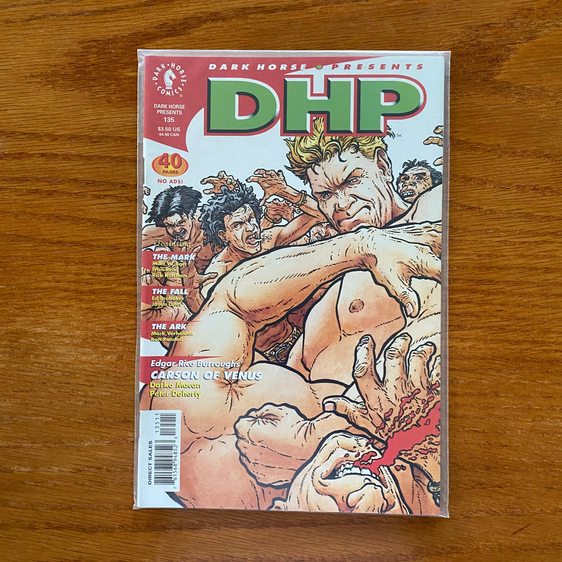 Cover by Geof Darrow. Witness the conclusion of Ed Brubaker and Jason Lute's "The Fall." Darko Macan and Peter Doherty bring their epic tale of Edgar Rice Burroughs' classic character to a close. "The Mark" is once again making the world a safer place, courtesy of Mike W. Barr and Ivan Reis. "The Ark" is coming to Earth and its inhabitants are none too fond of earthlings . . . will Guidry save mankind? Damn straight! B&W.