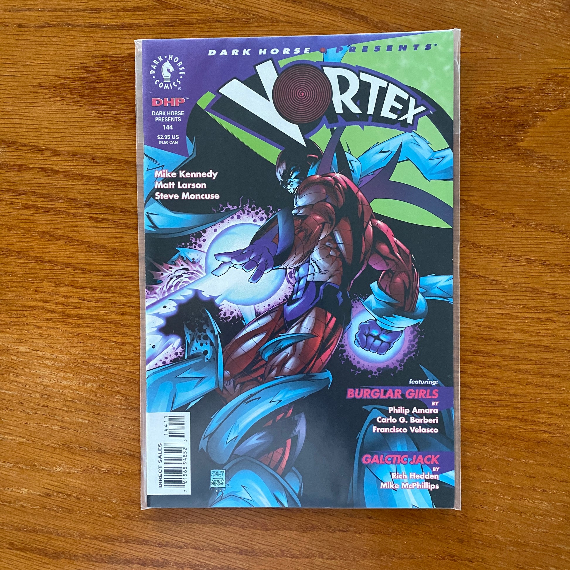 Cover by Javier Saltares. Three tales that run the gamut from superhero action to lighthearted adventure. First up, as a lead-in to his appearance in Ghost this month, Comics' Greatest World's Vortex battles monsters of his own making in a story by Mike Kennedy and Matt Larson. Also, introducing Philip Amara and Carlo Barberi's "Burglar Girls," three students attending a very peculiar academy for would-be thieves; and the spacefaring, robot-battling "Galactic Jack," the latest creation from Roachmill's Rich Hedden. B&W.