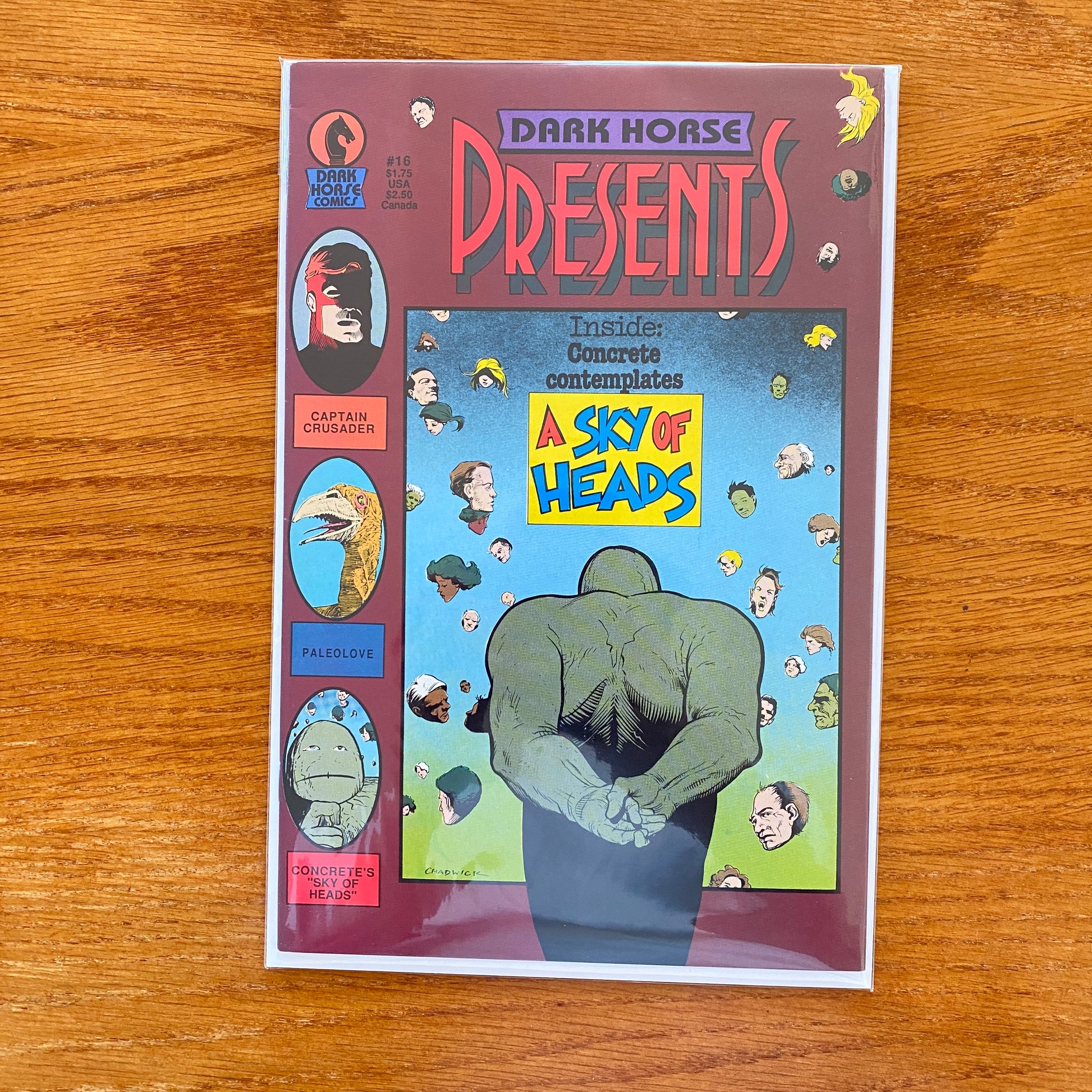 Cover by Paul Chadwick. In this issue, Concrete convinces Larry to watch his favorite late-night show, Sky of Heads, a popular cable program that contemplates the meaning and existence of the afterlife. Written and illustrated by Paul Chadwick. Also, another off-beat installment of Masque, written & illustrated by Mark Badger! Masque serves Denton hallucinatory truffles in a chi-chi restaurant! Always the best by Badger! Doom Patrol artist Gary Martin concludes his first work as writer/artist with Captain Crusader! In this final episode, Captain Crusader discovers what the harsh reality of being a "super hero" really is! 32 pages, B&W.