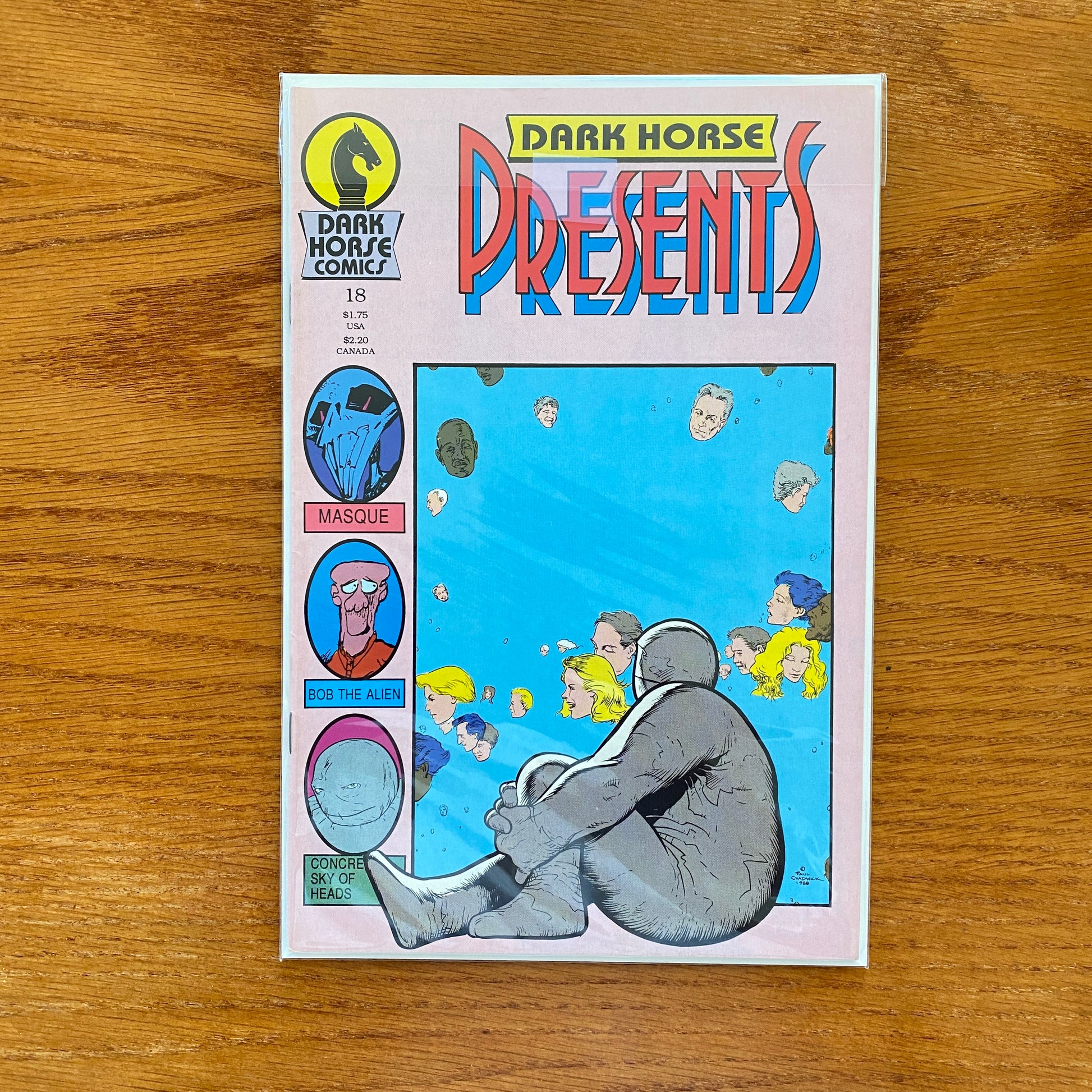 Cover by Paul Chadwick. Paul Chadwick's Concrete appears on the cover, and inside views another revealing episode of his favorite late-night TV show, Sky of Heads. Also inside, Mark Badger's Masque takes yet another bizarre twist, and Rich Rice's hilarious Bob the Alien (in his debut!) tries to get a date. Another "must have" issue of Dark Horse's flagship title. 32 pages, B&W