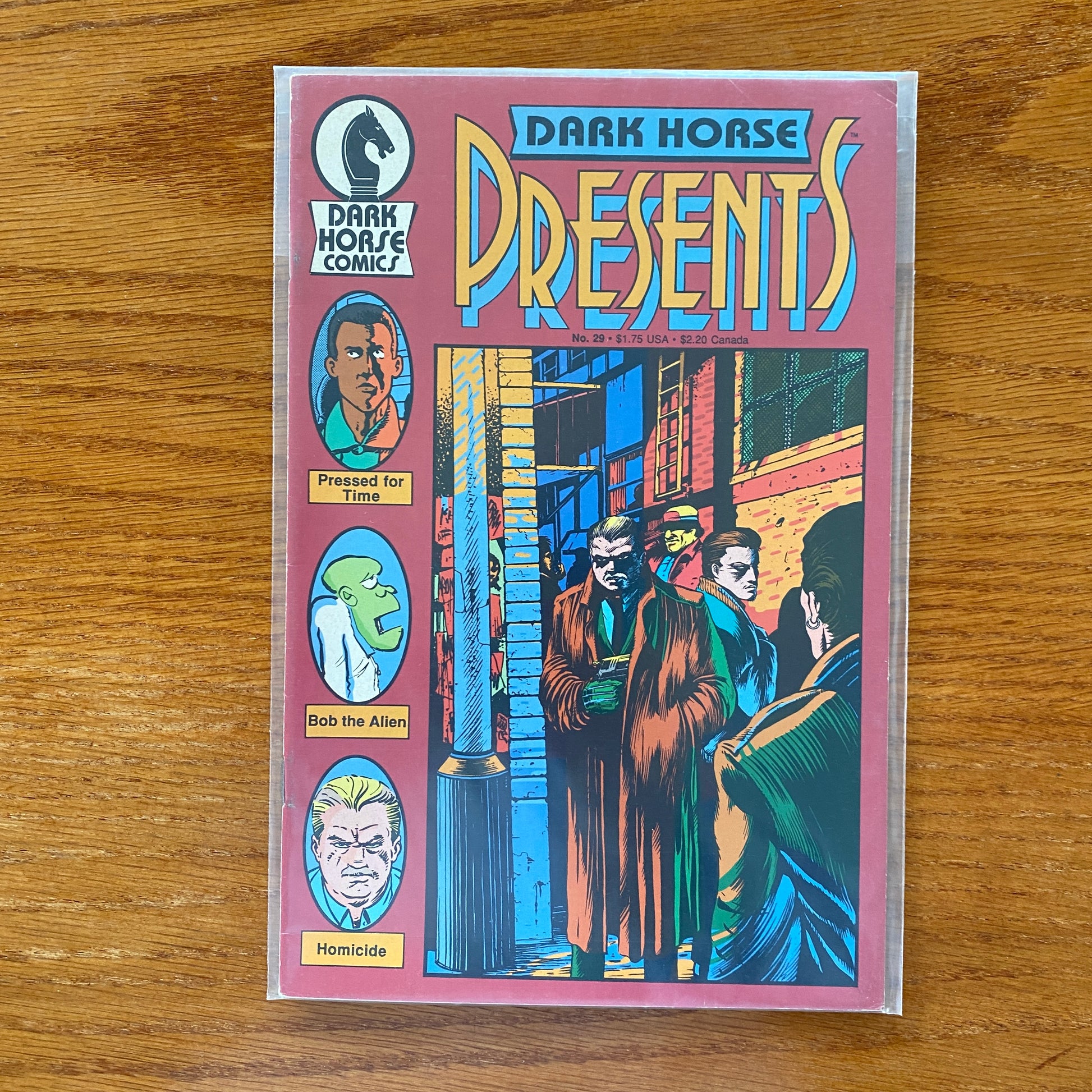 Cover by Doug Mahnke. Homicide returns with another dark, yet exciting episode, written by John Arcudi, art by Doug Mahnke. Also, Bob the Alien blunders through another aspect of life (is he really so different from any of us on a bad day?) from creator Rich Rice, and we present a second offering from Andrew Murphy entitled "Pressed for Time". 32 pages, B&W. Cover price $1.75.
