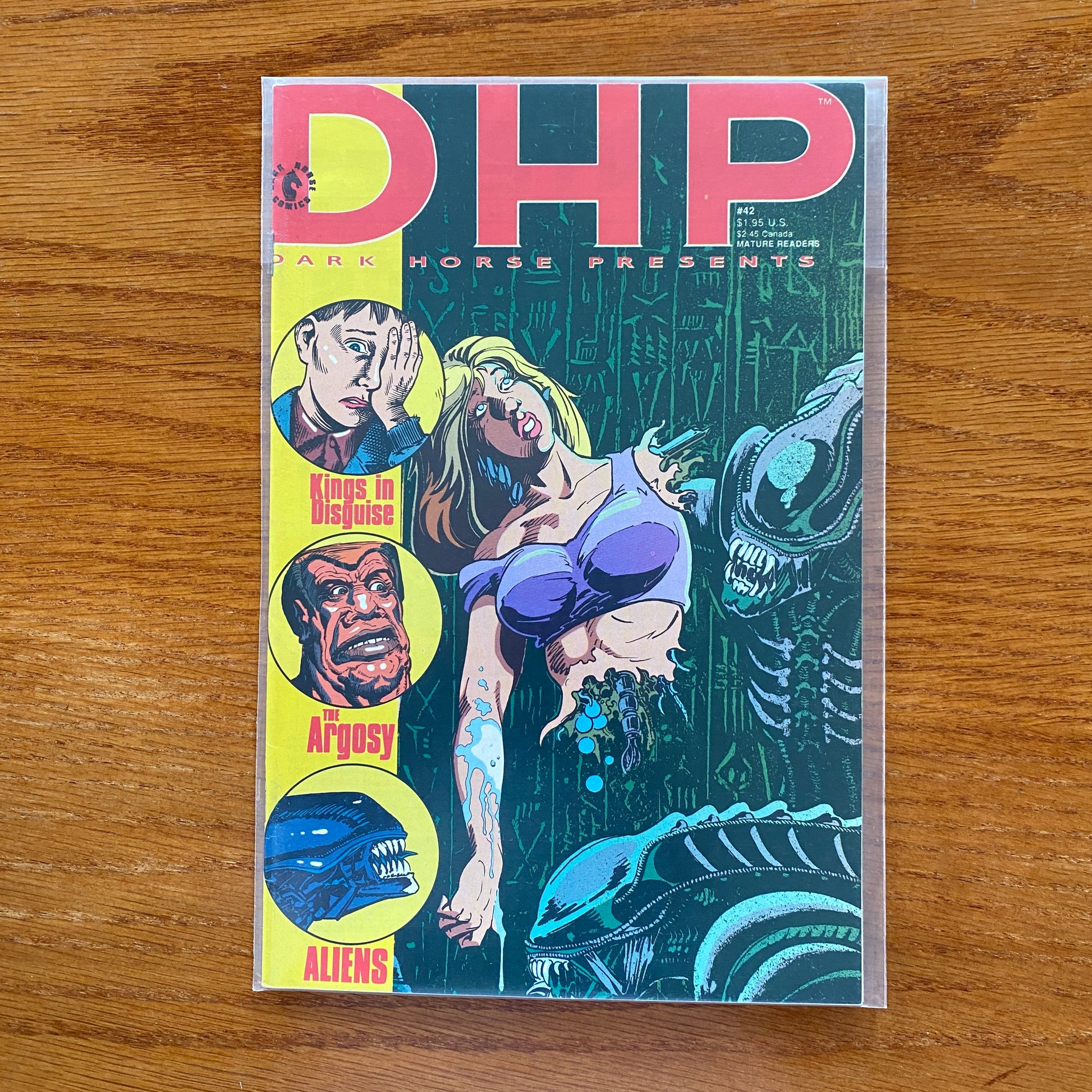 Cover by Paul Guinan. Dark Horse comics premiere anthology presents in this issue the beginning of a two-part Aliens saga, by Heartbreakers co-creator Paul Guinan! Other features this issue include a Dark Horse/Kitchen Sink co-presentation- a preview to the sequel to the Harvey and Eisner award-winning series Kings in Disguise by creators Dan Burr and Jim Vance, plus the penultimate chapter in Bruce Zick's interstellar myth-odyssey, Argosy! 32 pages, B&W.