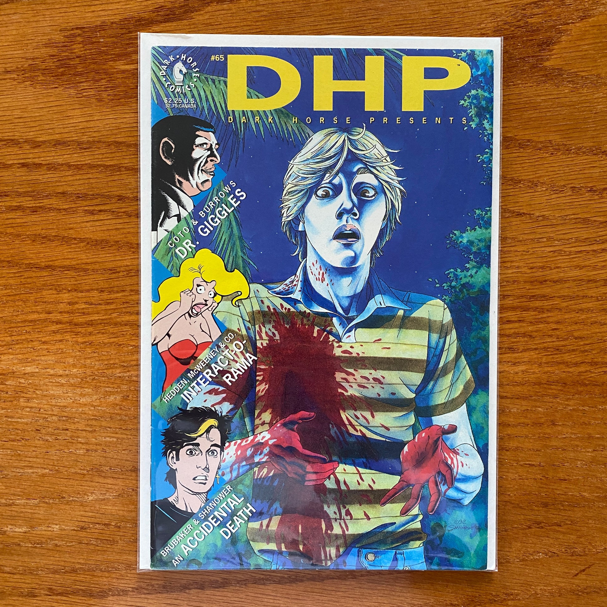Cover by Eric Shanower. Writer Ed Brubaker and artist Eric Shanower deliver an unflinching look at a true story of teen lust gone awry in the first installment of "Accidental Death." Then, writer/director Manny Coto and artist Alan J. Burrows delve deeper into the demented mind of "Dr. Giggles" in episode two of the three-part prequel to the upcoming film of the same name! Finally, via the miracle of "Interact-O-Rama," Dark Horse offers the world's first create-it-yourself interactive comics story. You decide the page order! You decide what the characters are saying! Plus, we'll give prizes for the best versions sent in by our readers! Special 100% paper cut-out "glasses" included on the back cover of every issue! Story by the Dark Horse Department of Interact-O-Rama, art by the Roachmill team of Rich Hedden and Tom McWeeney. Painted cover by Eric Shanower. 32 pages, B&W.