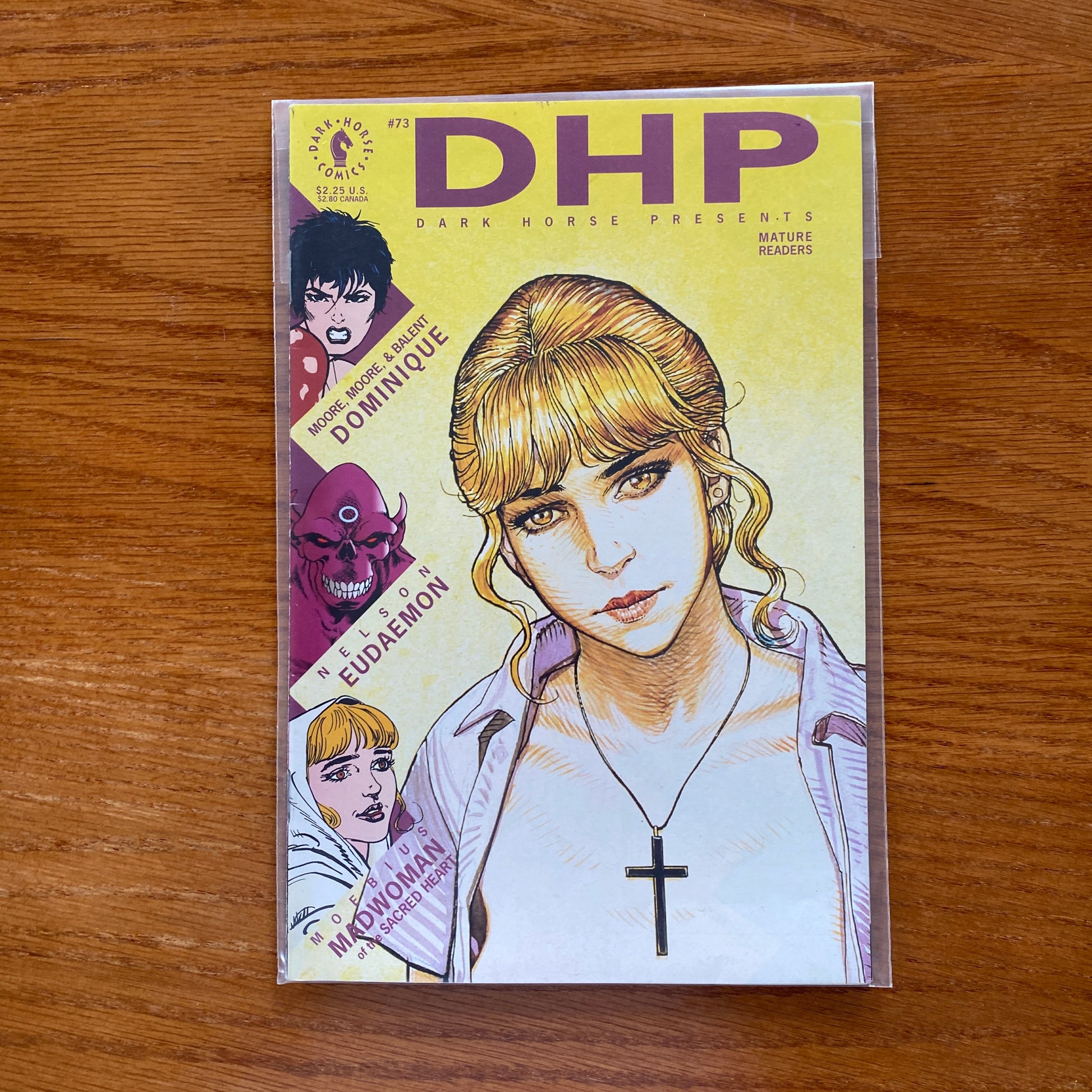 Cover by Moebius. "The Madwoman of the Sacred Heart," takes a metaphysical turn as Alain Mangel is confronted by a gigantic apparition. In Dominique, our heroine is in a race against time to save a child from a Yakuza warlord -- so why is the FBI trying to stop her? And, in part two of the three-part lead-in to Nelson's Eudaemon miniseries, Ed Pensa finds that an M-16 is cold comfort in the hellish dimension to which Eudaemon has transported him. B&W.