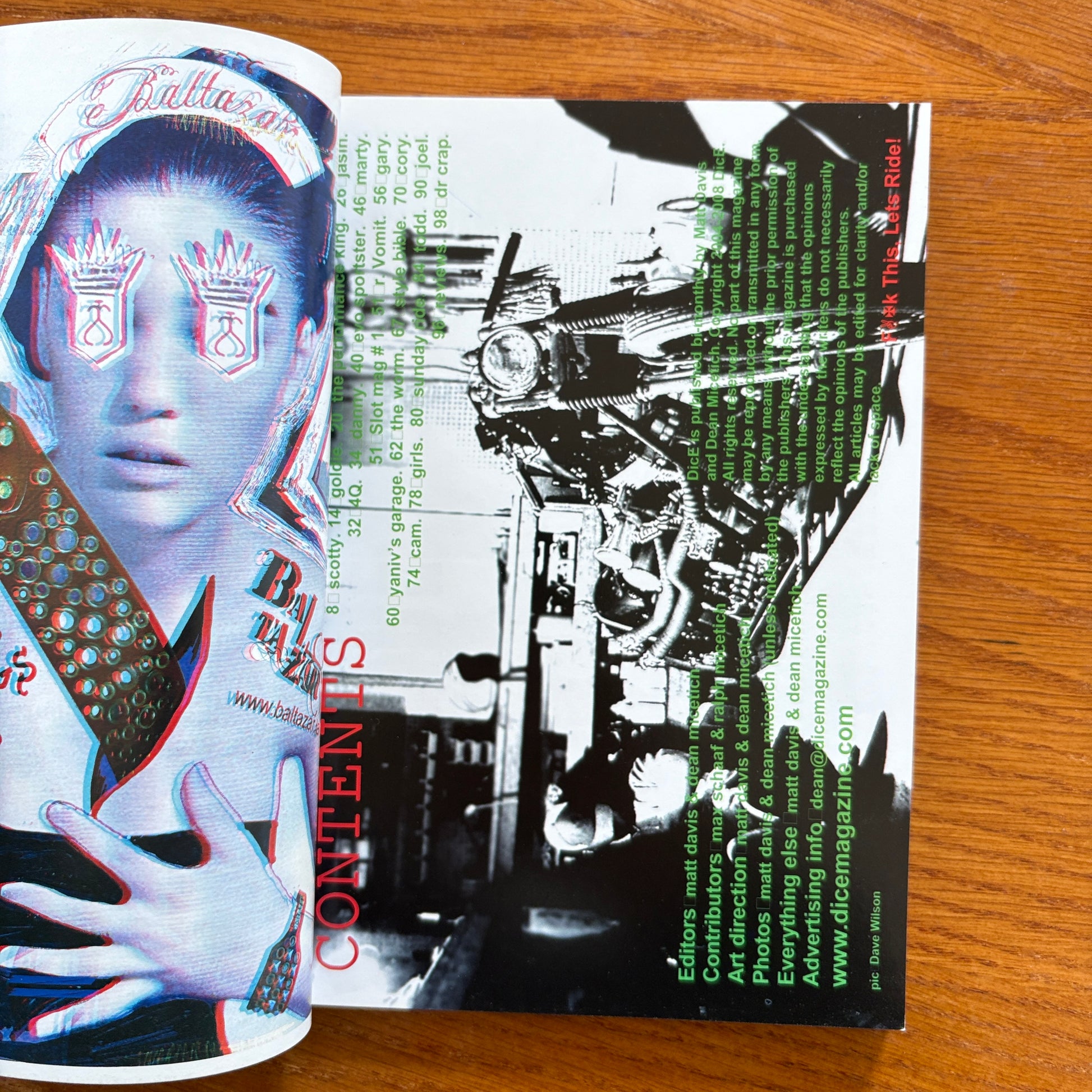 A chaotic, grease-stained lineup of builders and oddballs, this issue kicks off with Scotty, Gold King, and Jasin, rolling straight into rough-cut features like 14Q, Danny, and the Levo Sportster. Midway, the mag hits Marty, Slot Mag #1, and Cr. Vomit, followed by Gary, a stop inside Yaniv’s Garage, and the raw personality of The Worm. The Style Bible leads into Cory, Cam, and the classic Girls spread, before dropping into Sunday Do Todd, Joel, and the irreverent closer Dr. Crap. Pure DicE energy—loud, messy, funny, and ready to ride.