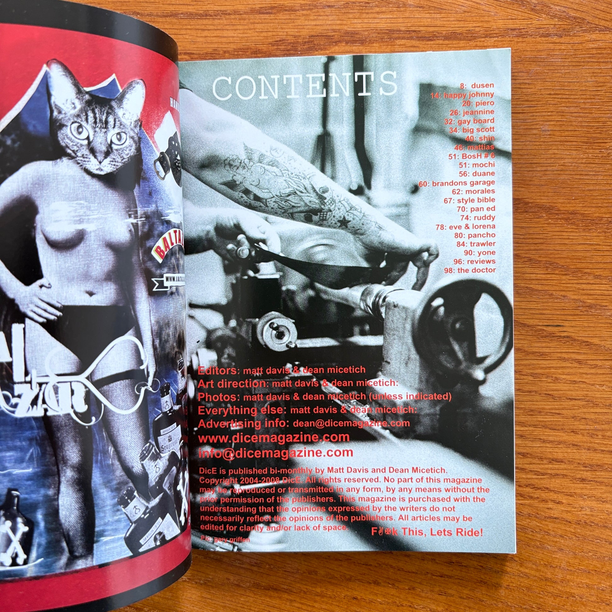 This issue fires through a packed roster of builders and scene characters, opening with Dusen, Happy Johnny, and Piero before sliding into features on Jeannine, Gay Board, Big Scott, and Shin. The mid-mag run highlights Mattias, Bosh #6, Mochi, and Duane, followed by a stop inside Brandon’s Garage and a profile on Morales. The Style Bible bridges into Pan Ed, Ruddy, Eve & Lorena, Pancho, and Trawler, with Yone closing out the lineup before reviews and the final hit from The Doctor. A loose, fast, character-heavy slice of DicE attitude.