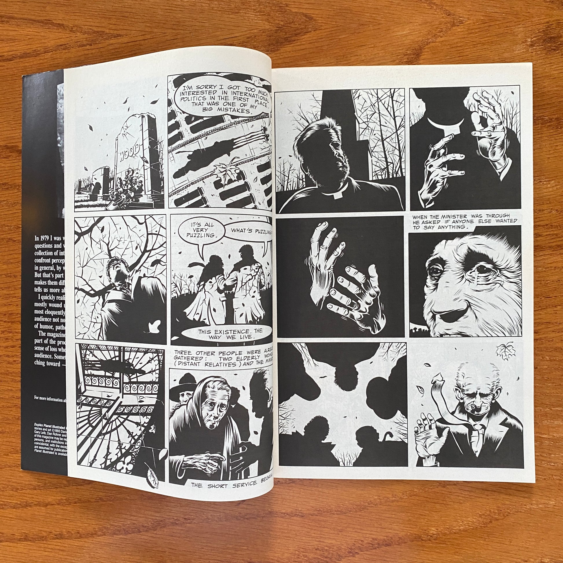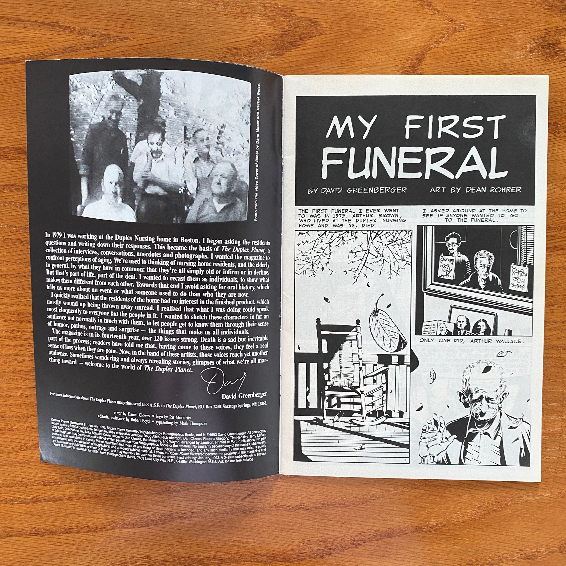 Comic book version of Duplex Planet fanzine. The Duplex Planet began in 1979 when David Greenberger worked at the Duplex Nursing Home in Boston. It is a magazine comprised of interviews and conversations with the elderly residents of the home, revealing their innate wit, armchair philosophies and their sometimes senile but profound stream of conciousness observations. Starting in 1992 a variety of artists began working with David on Duplex Planet Illustrated.