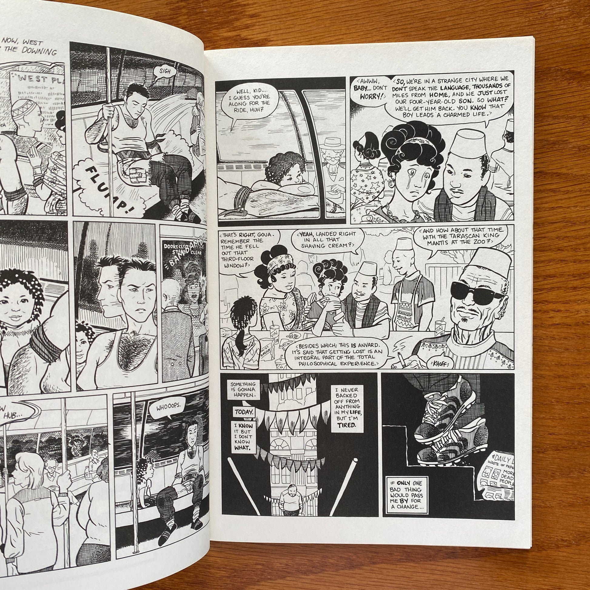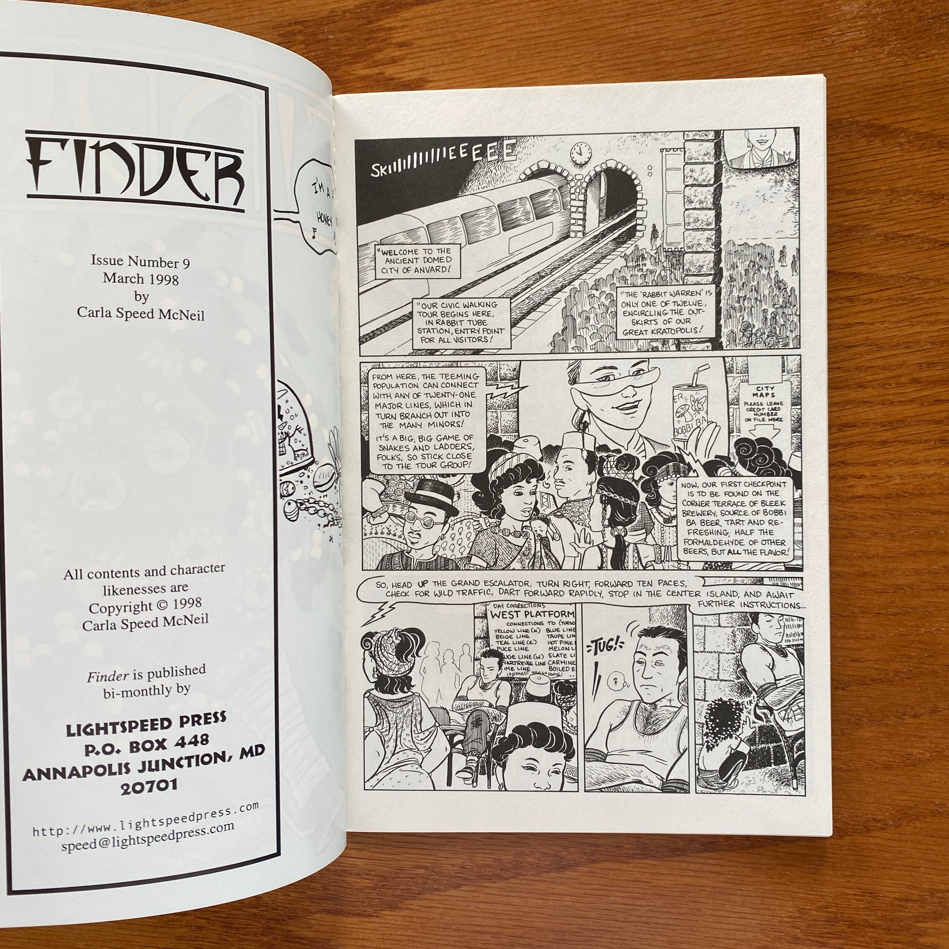 Cover art by Carla Speed McNeil. Finder, script and art by Carla Speed McNeil; Jaeger takes a lost tot on a tour of Anvard; During his trip, he encounters Brigham, who has flipped out and tried to kill a Llaverac woman; Jaeger knocks him unconscious and takes him to a Medawar charity hospital. Marcie dancing in a spiral inside covers and back cover art by McNeil. 28 pgs.