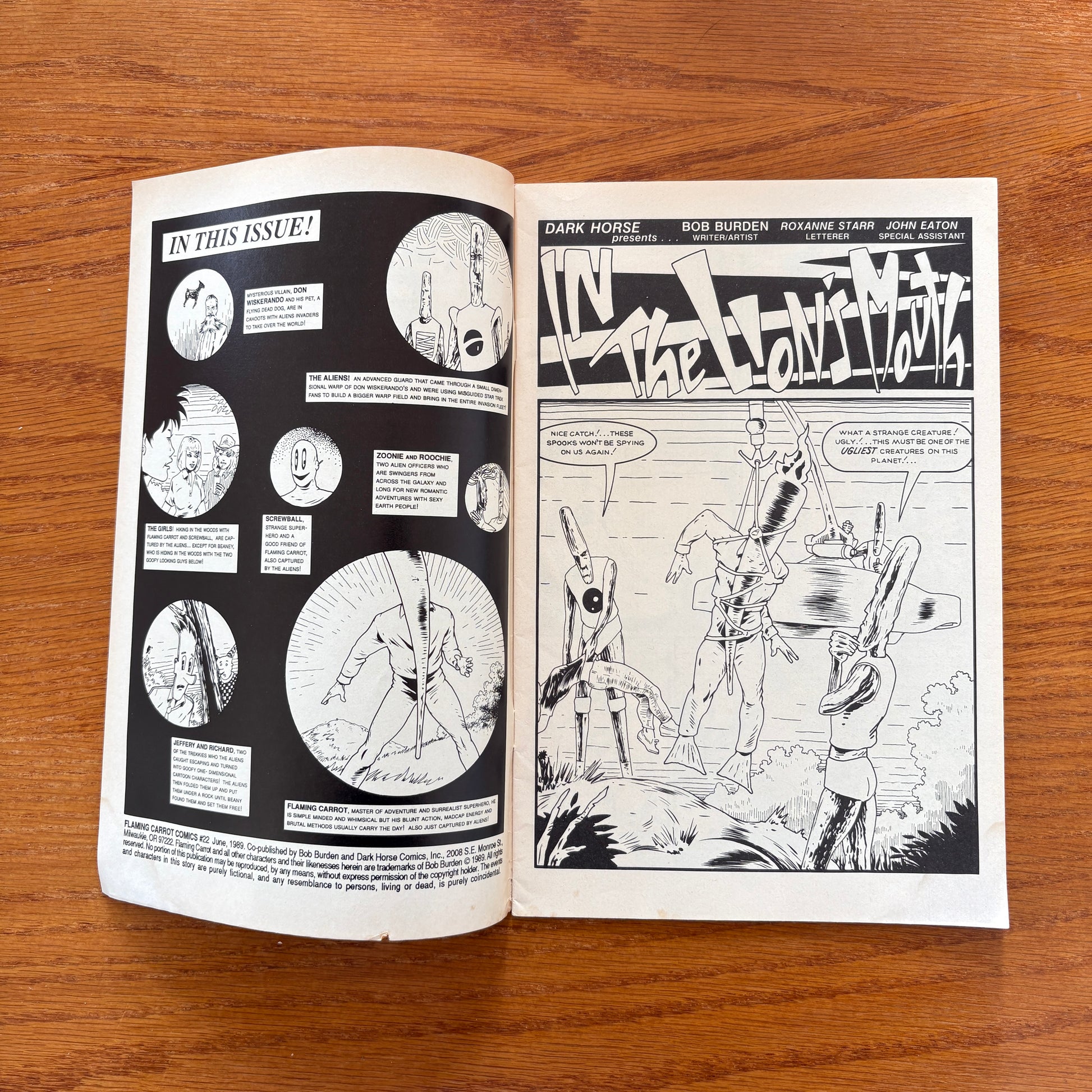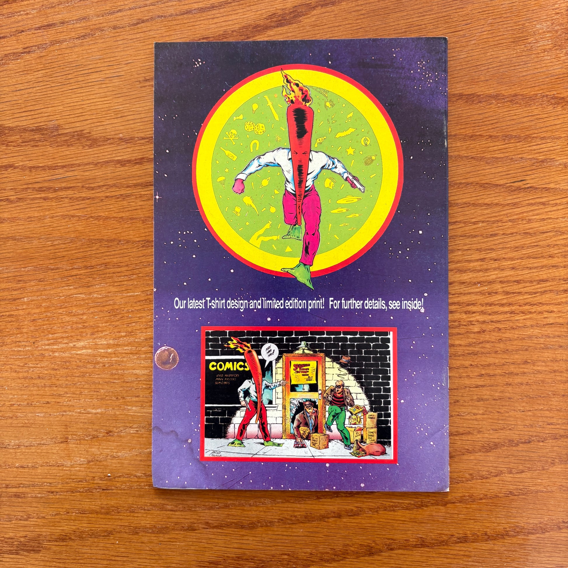 Story and art by Bob Burden. Captured by Space Aliens, Flaming Carrot, Screwball and the Trekkies are subjected to weird, inhuman experiments--which have the unexpected side-effect of giving Flaming Carrot a new power! Many Trekkies die fighting valiantly for Earth before Flaming Carrot and Screwball overcome the evil invaders from another world! 32 pages, B&W.