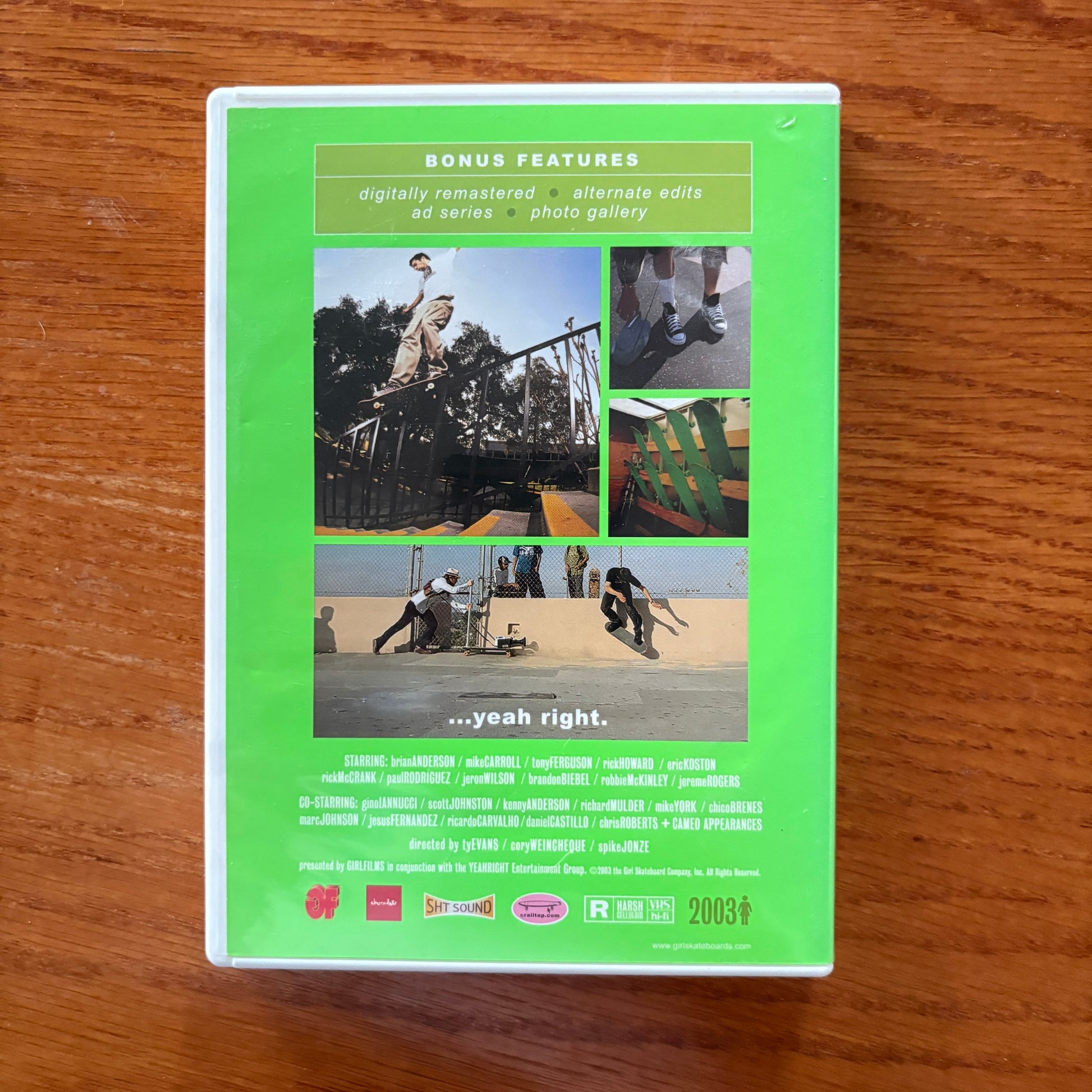 Yeah Right, the 2003 skateboarding video from Girl Skateboards, is largely considered one of the most influential skate films of all time. Directed by Ty Evans and Spike Jonze, Yeah Right! is notable for its soundtrack, length, and the extensive use of special effects. The intro is one of the first films to capture skateboarding in ultra-slow motion. Yeah Right also features the celebrated 'Invisible Board' skit.