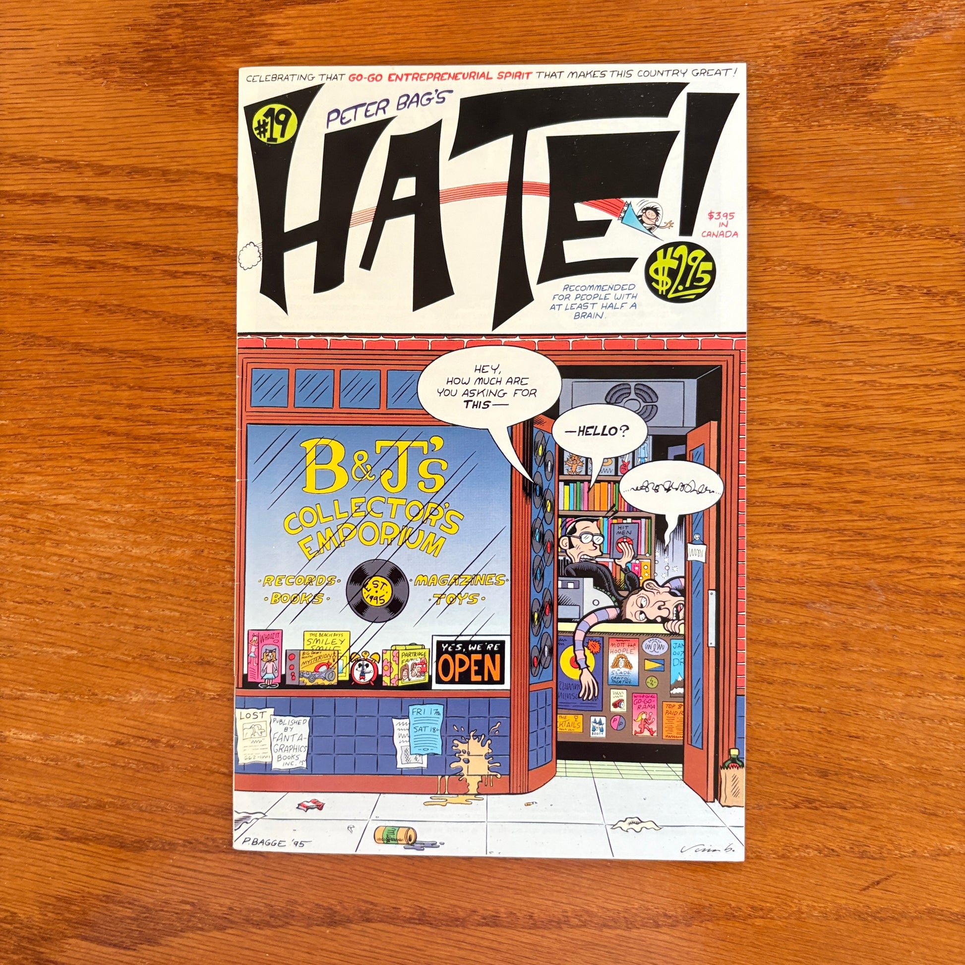 In "Partners," Buddy and Jay celebrate the grand opening of their new collectibles shop (called B&J's Collector's Emporium), providing ample humor for (and skewering of) collectors and store owners alike. A druggy urinating into a Marvel Comics coffee mug exemplifies Bagge's depraved sense of humor and his cynical obsession with satire. Written and drawn by Peter Bagge, with inks by Jim Blanchard.