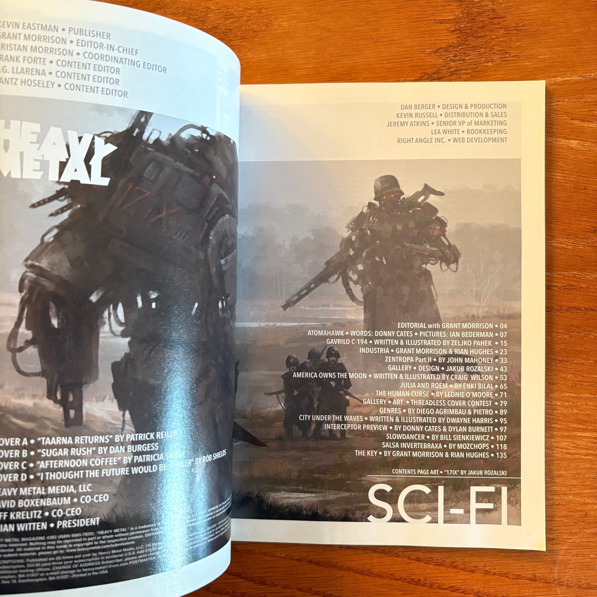 Heavy Metal Issue #282, released in September 2016, is themed the "Sci-Fi Special" and showcases a collection of science fiction narratives and artworks. Under the editorial direction of Grant Morrison, this edition features a blend of standalone stories and serialized content, highlighting the works of various writers and artists.