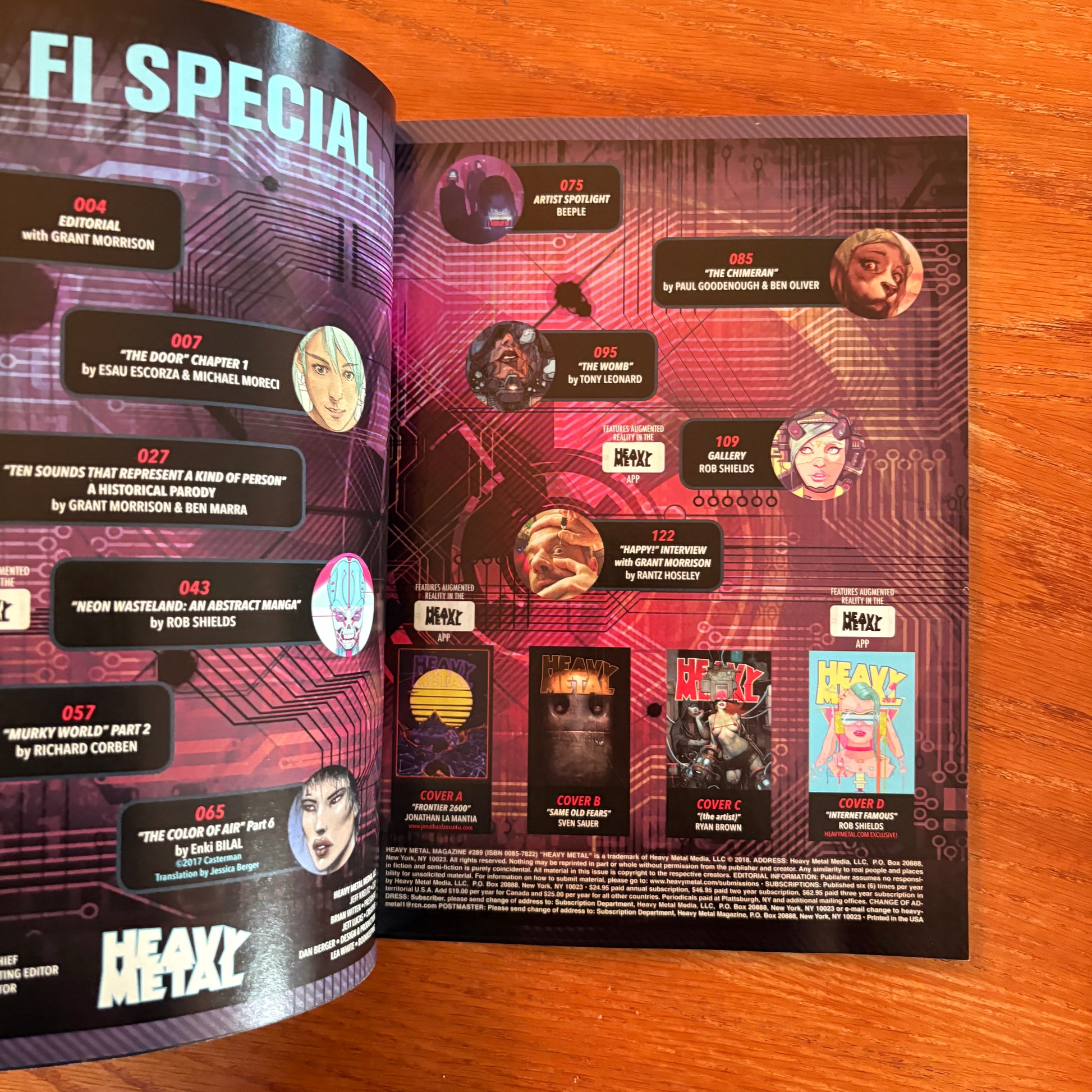Heavy Metal #289, released in March 2018, is a landmark issue titled "The Sci-Fi Special." This edition is notable for being the magazine's first interactive issue, incorporating an augmented reality (AR) app for iPhone and Android devices, allowing readers to engage with select stories and artwork in an immersive way .Key Features and Stories: