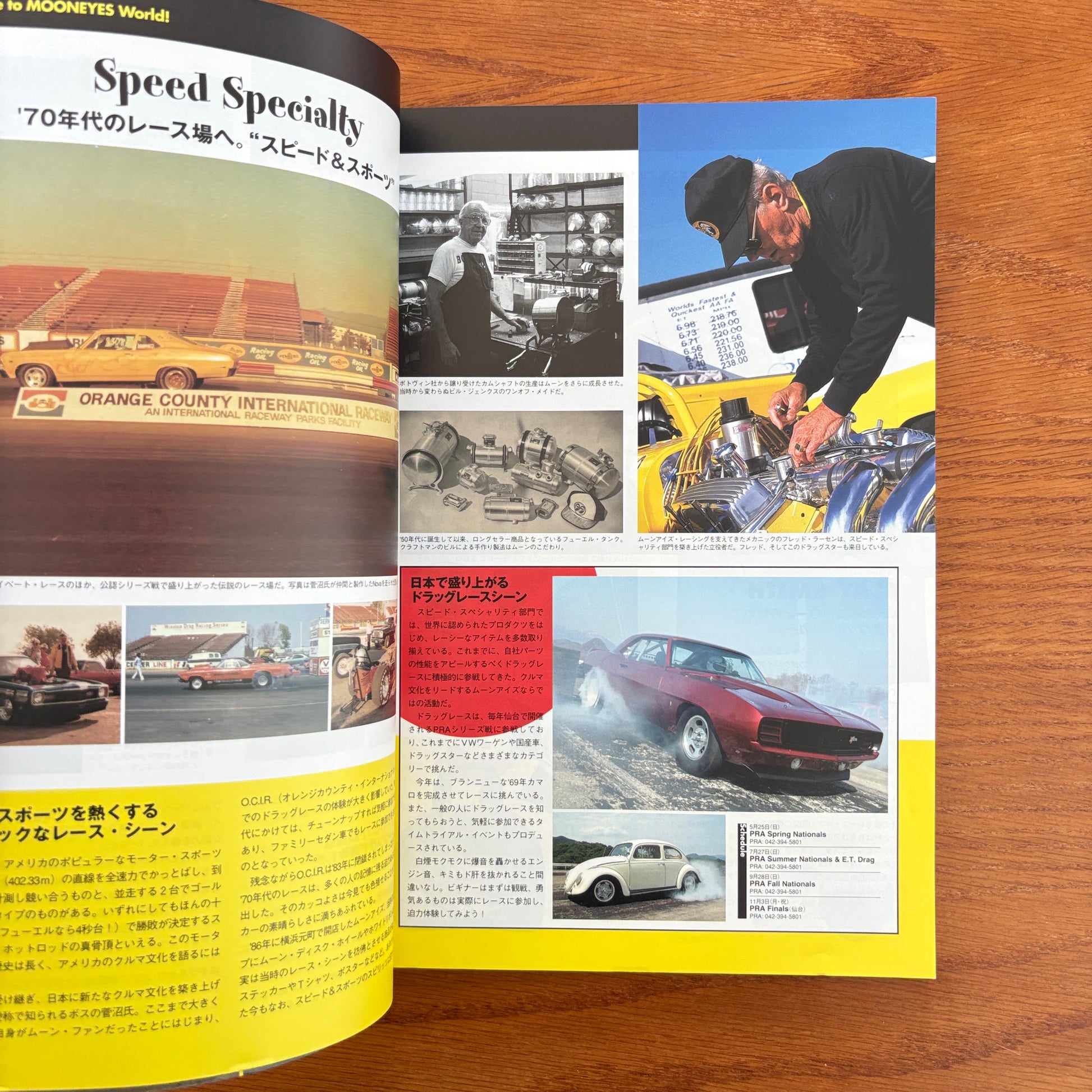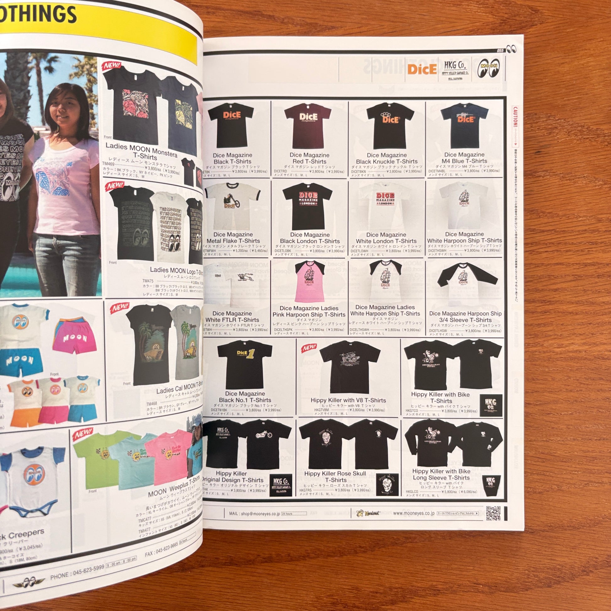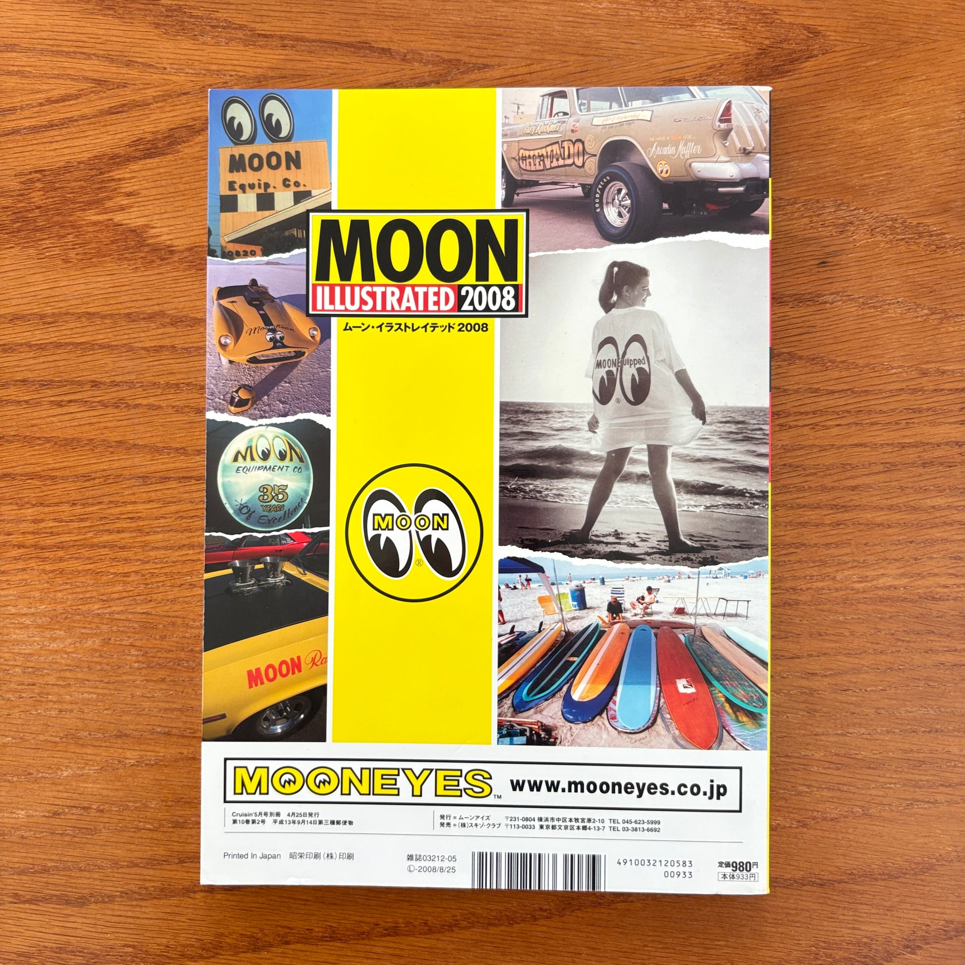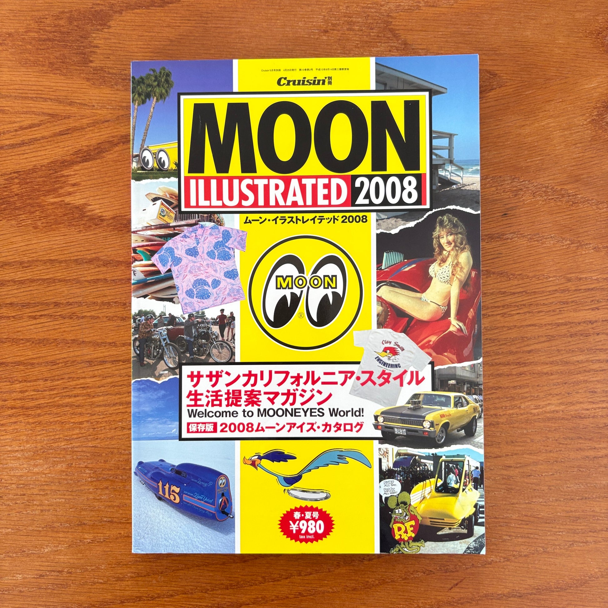 This issue is a loud, sun-bleached blast of Southern California car culture filtered through Japan’s MOONEYES lens. It mixes hot rods, choppers, pin-up aesthetics, surf style, and bold graphic layouts into a hybrid magazine-catalogue. Inside, you get features on custom builds, lowbrow Americana, retro-inspired fashion, MOONEYES merch, and snapshots of the SoCal dream—vintage cars on the coast, salt-flat racers, beachside garages, and wild T-shirts that look ripped from a 1970s road-trip postcard. It’s part lifestyle guide, part product catalogue, part visual scrapbook of everything MOONEYES stands for: bright colours, chrome nostalgia, and the fantasy of cruising through an endless California summer.
