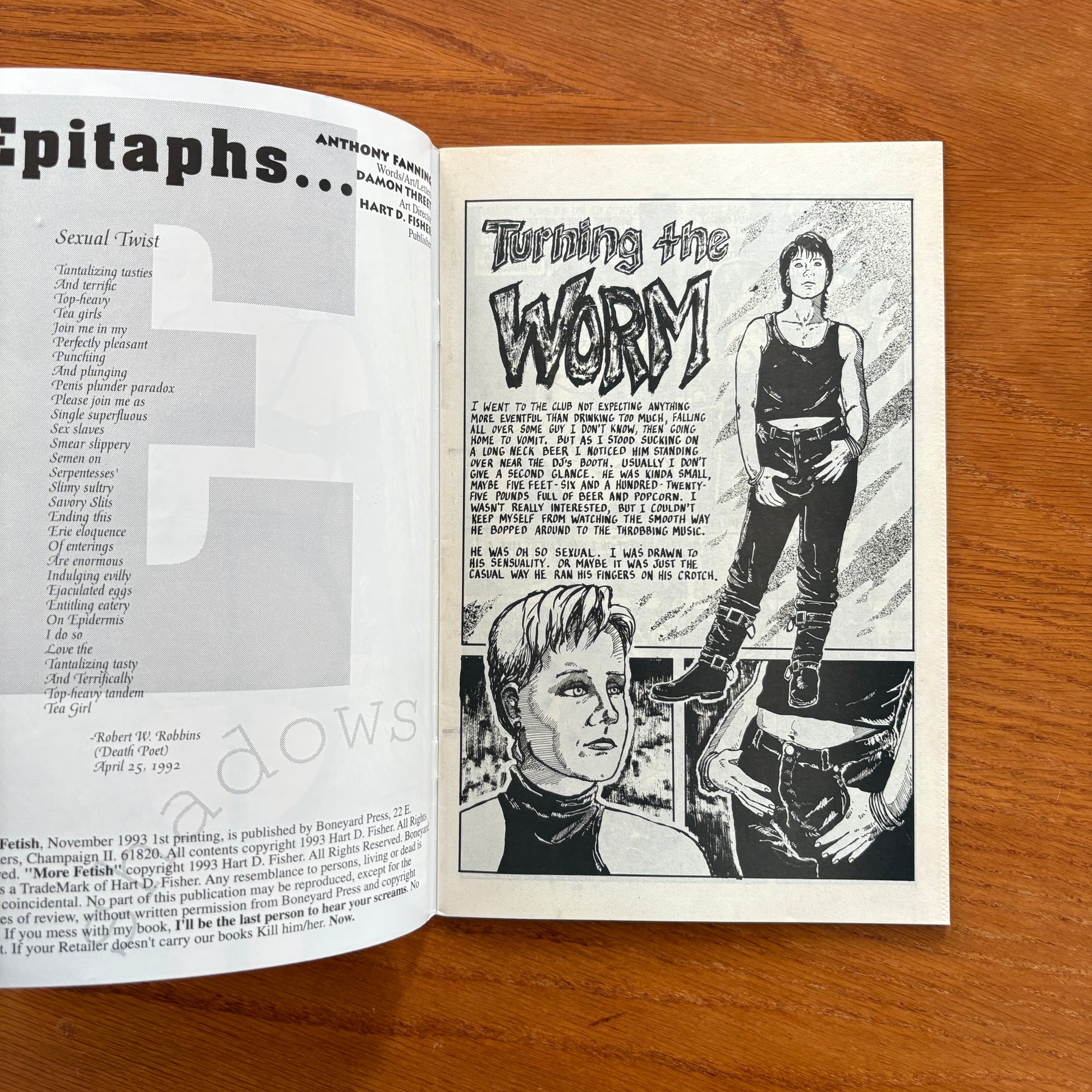 Fetish / More Fetish (Boneyard Press, 1993, 1st printing) – A 1993 adult comic by Hart D. Fisher, published by Boneyard Press. Featuring explicit fetish-themed stories, this underground trade showcases provocative, edgy content typical of Fisher’s work. First printing collectible edition, with all rights reserved. Bold, shocking, and unapologetically adult, it’s a must-have for collectors of 1990s underground erotica comics.