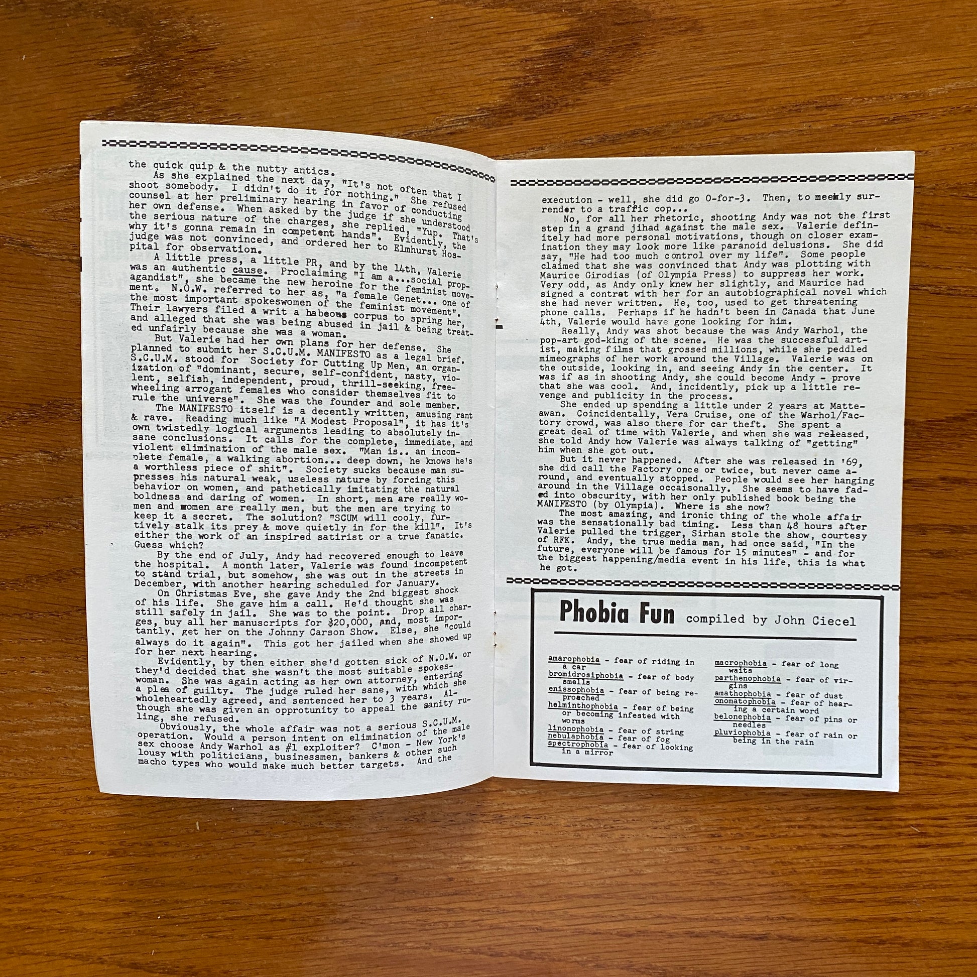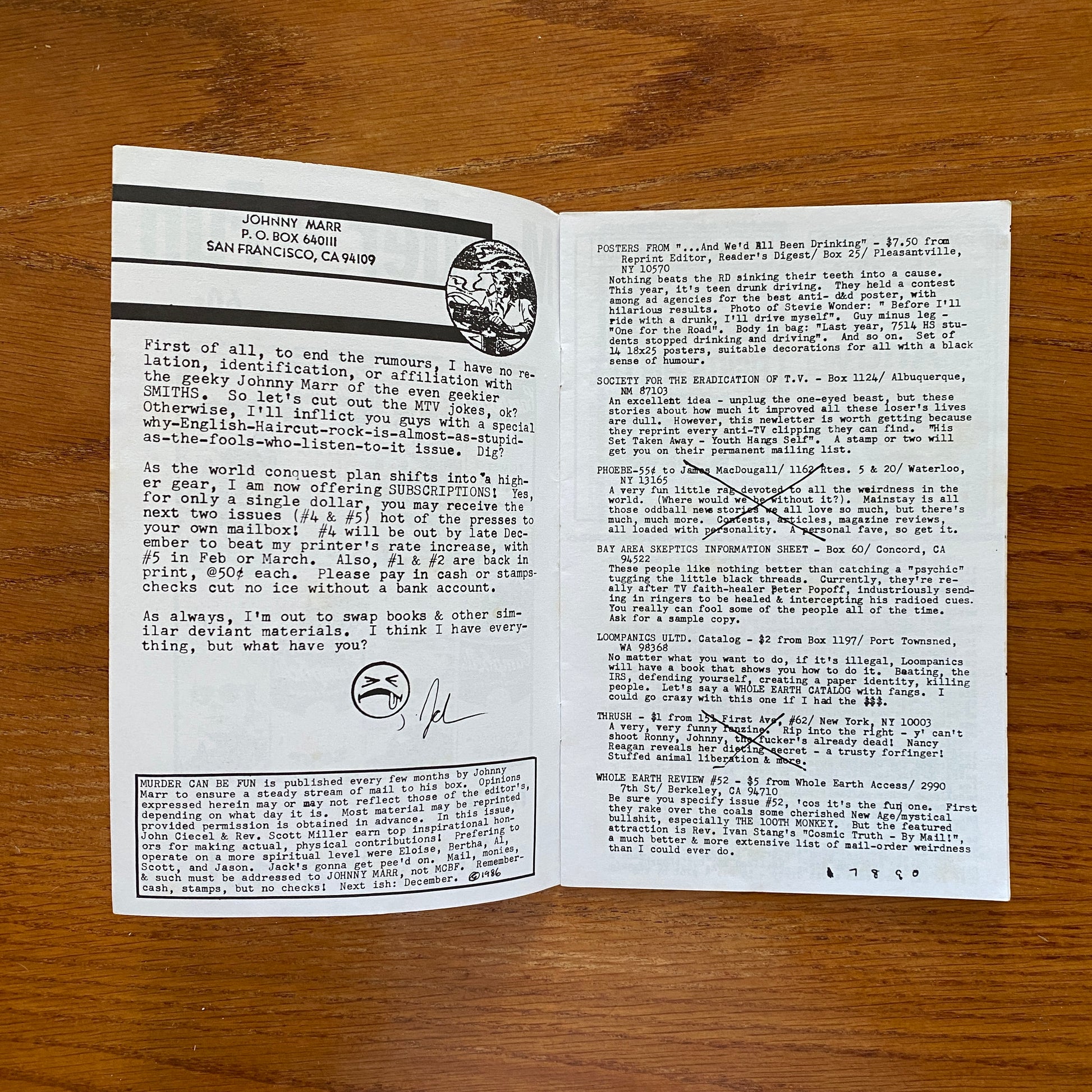 John Marr began publishing the zine in 1986 out of San Francisco, CA. This long-running zine has been in existence for more than twenty years. For each issue Marr painstakingly researches murders and deaths, documenting them in an entertaining way.