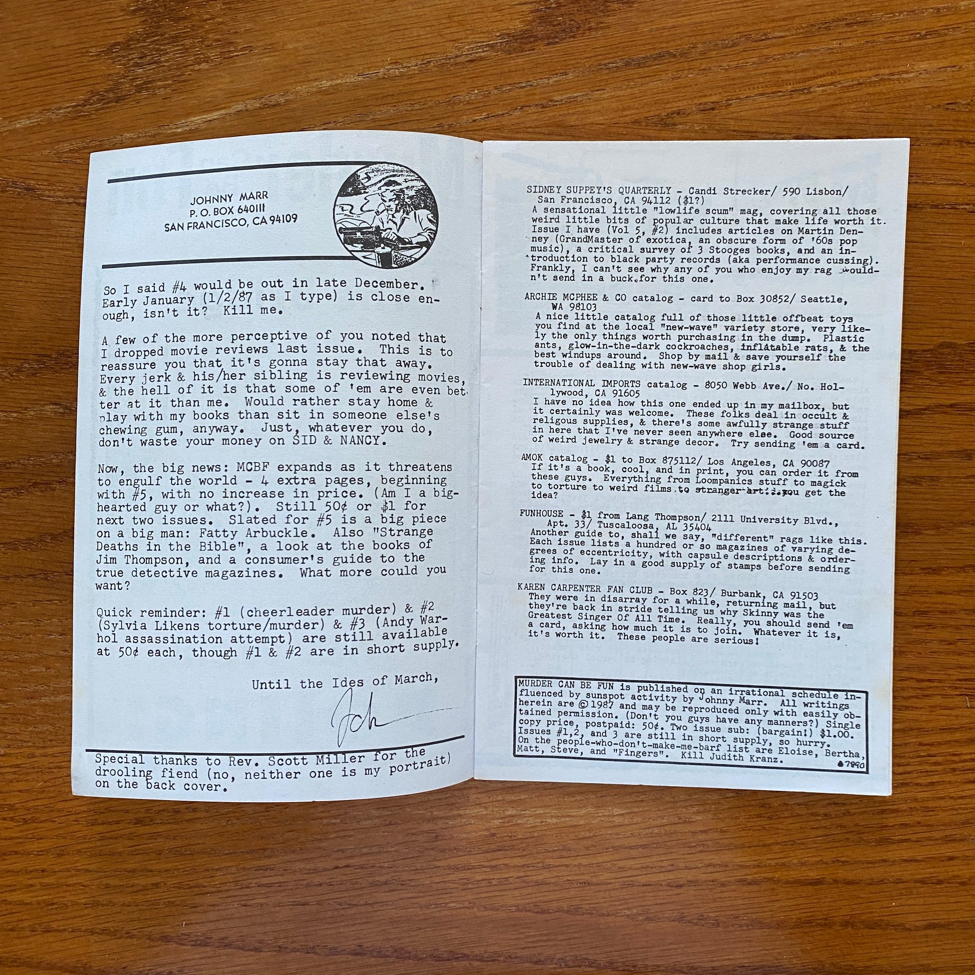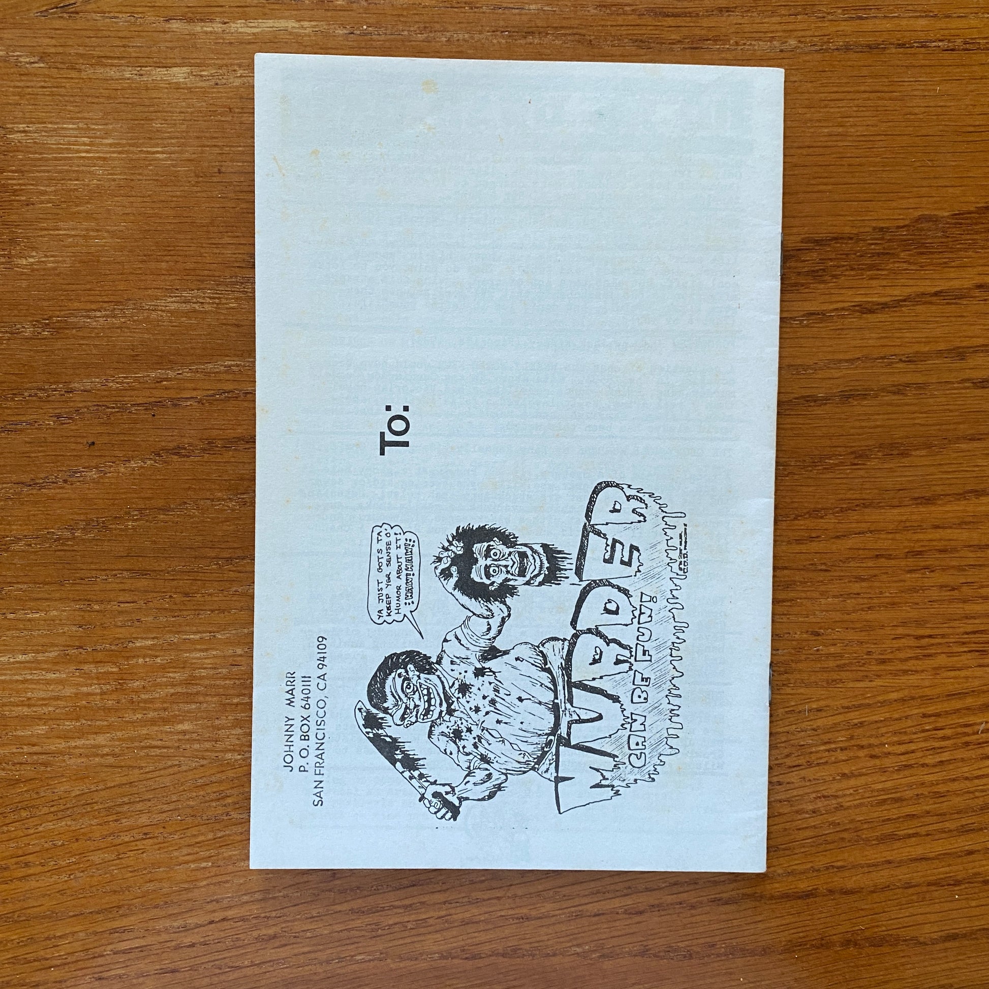 John Marr began publishing the zine in 1986 out of San Francisco, CA. This long-running zine has been in existence for more than twenty years. For each issue Marr painstakingly researches murders and deaths, documenting them in an entertaining way.