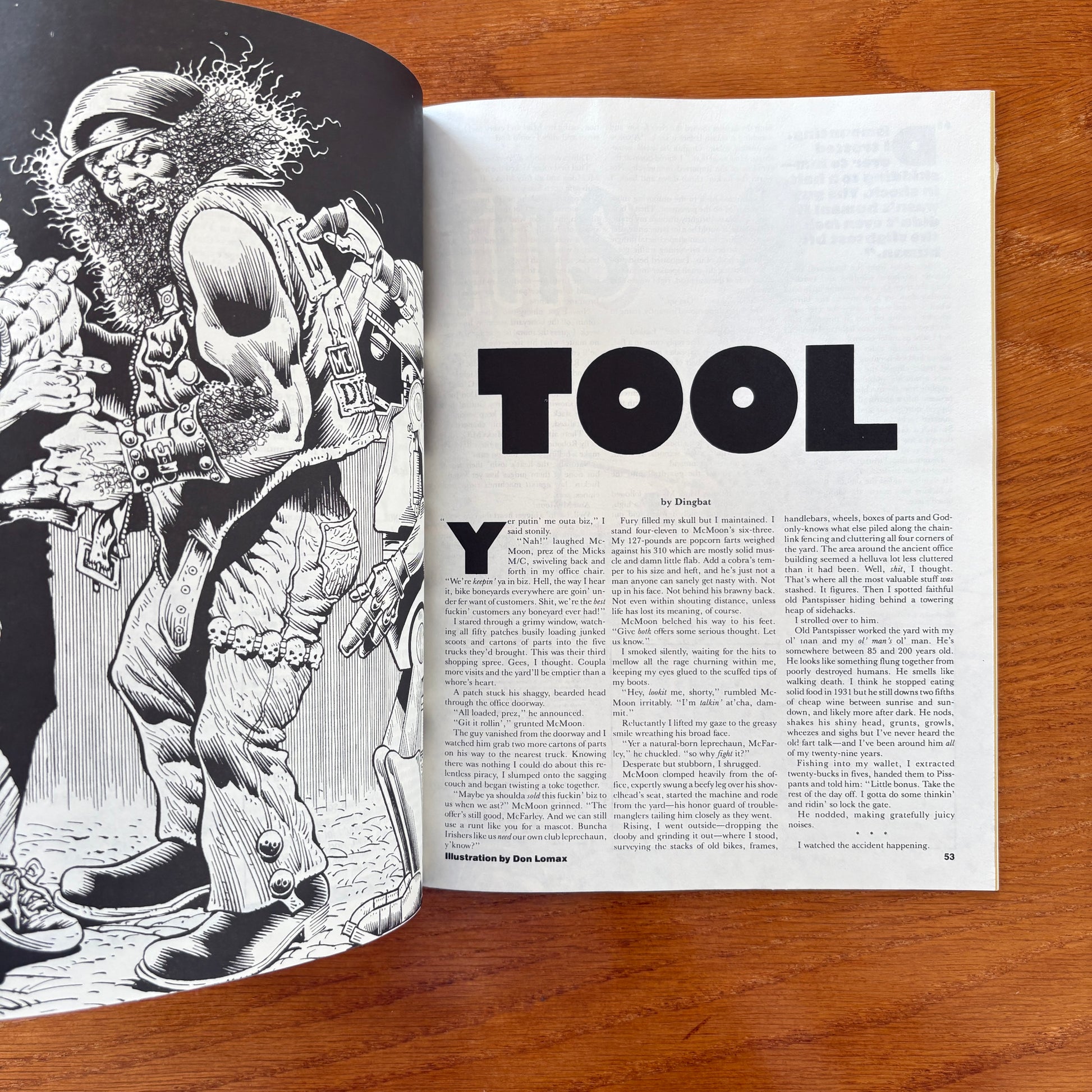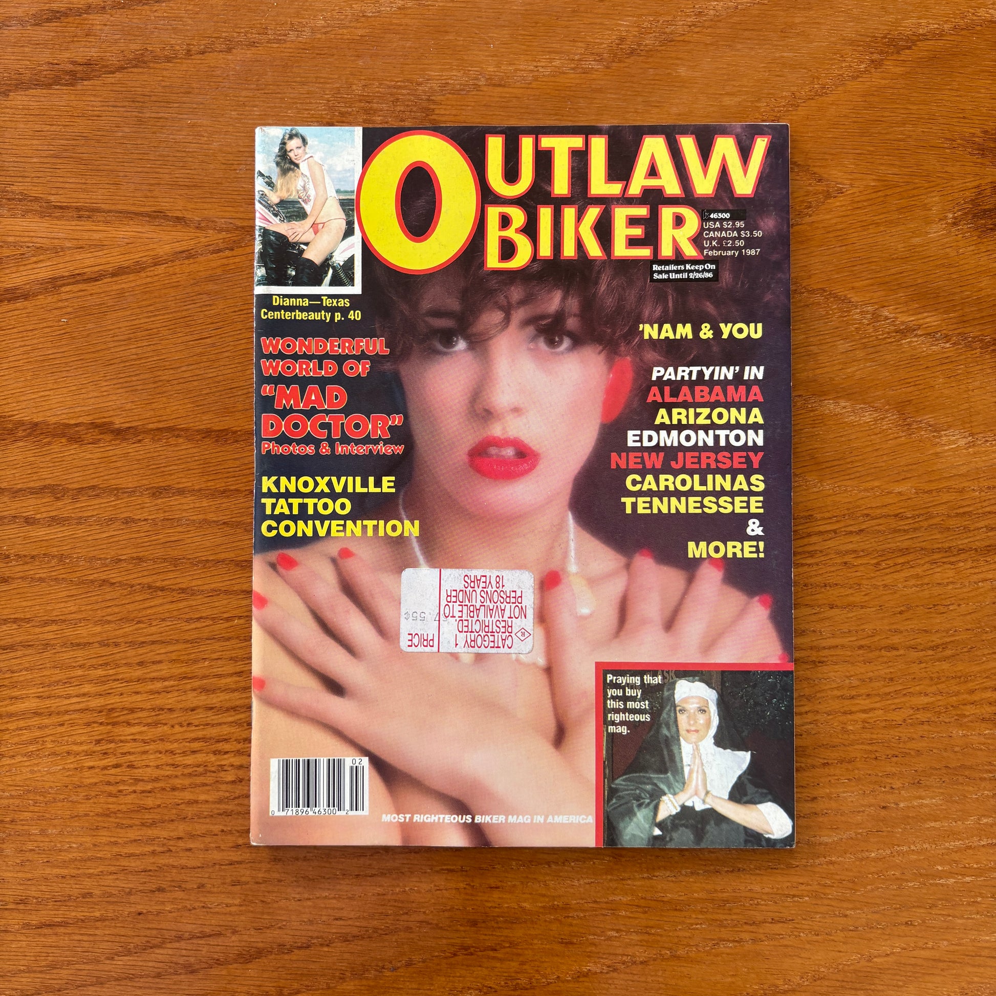 Fiction comes in strong with “Escape Artist” by Ned, “Tool” by Dingbat, and an Outlaw poem by Jody Via. Readers also get a chance to test their bonds in “Your Best Friend Quiz” by Rat. The magazine's signature visuals return with “Dianna” as the Outlaw Lady of the Month, and the “Tits” and “Tats” sections stay true to form with full-page spreads of readers and models living it up. “Bike of the Month” makes room for a spotlight ride, and “Future Bikers of America” shows the next generation of gearheads already in motion.