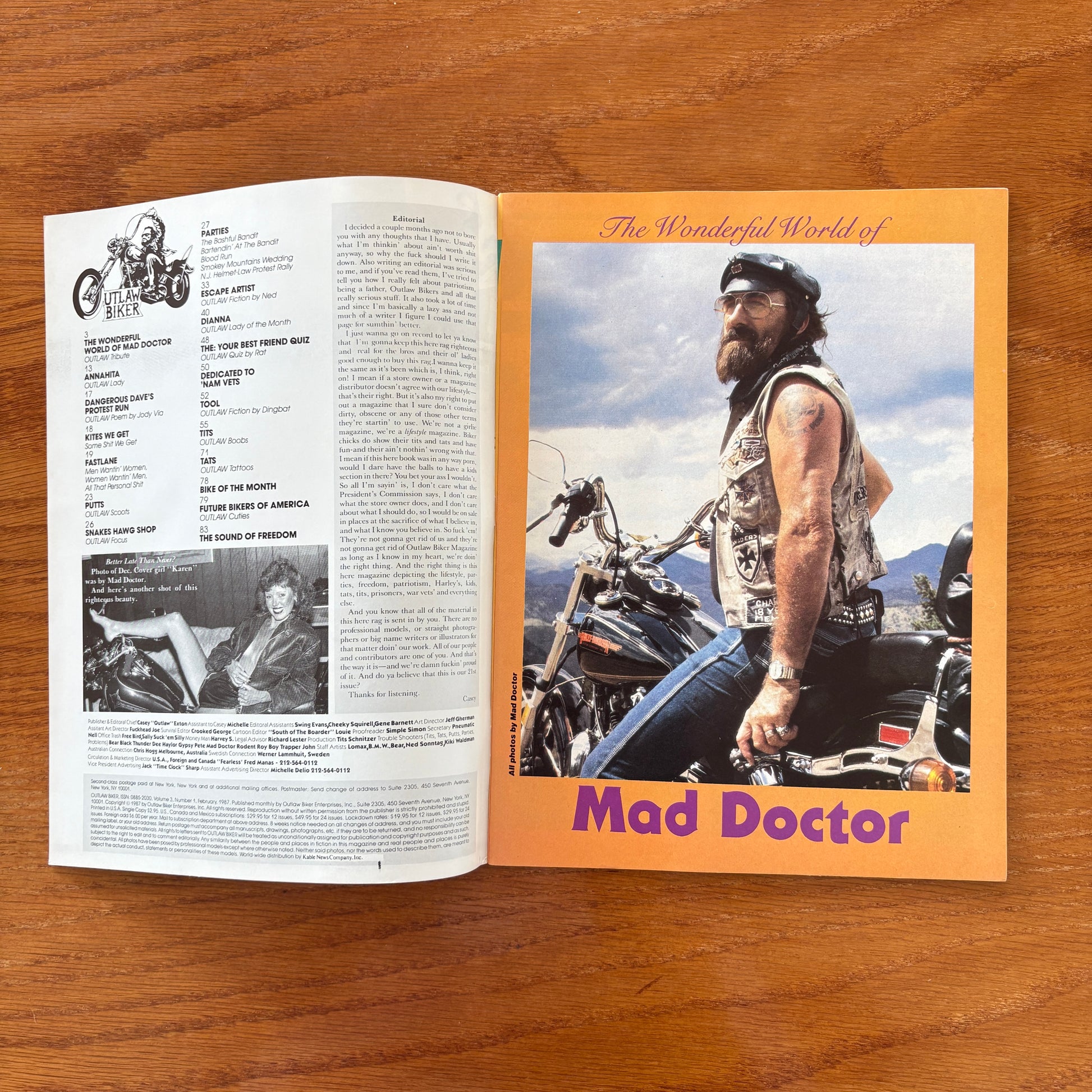 This issue of Outlaw Biker opens with a tribute to the late AnnaHita and keeps things raw and real from there on out. The “Wonderful World of Mad Doctor” showcases more gritty photos from one of the mag’s most defining contributors, and editor Casey “Outlaw” Exton kicks off the editorial section with a defiant stance against censorship, doubling down on the mag’s mission to reflect real biker life—tats, tits, Harleys, and all—without apology. He makes it clear: this isn’t porn, it’s a lifestyle.