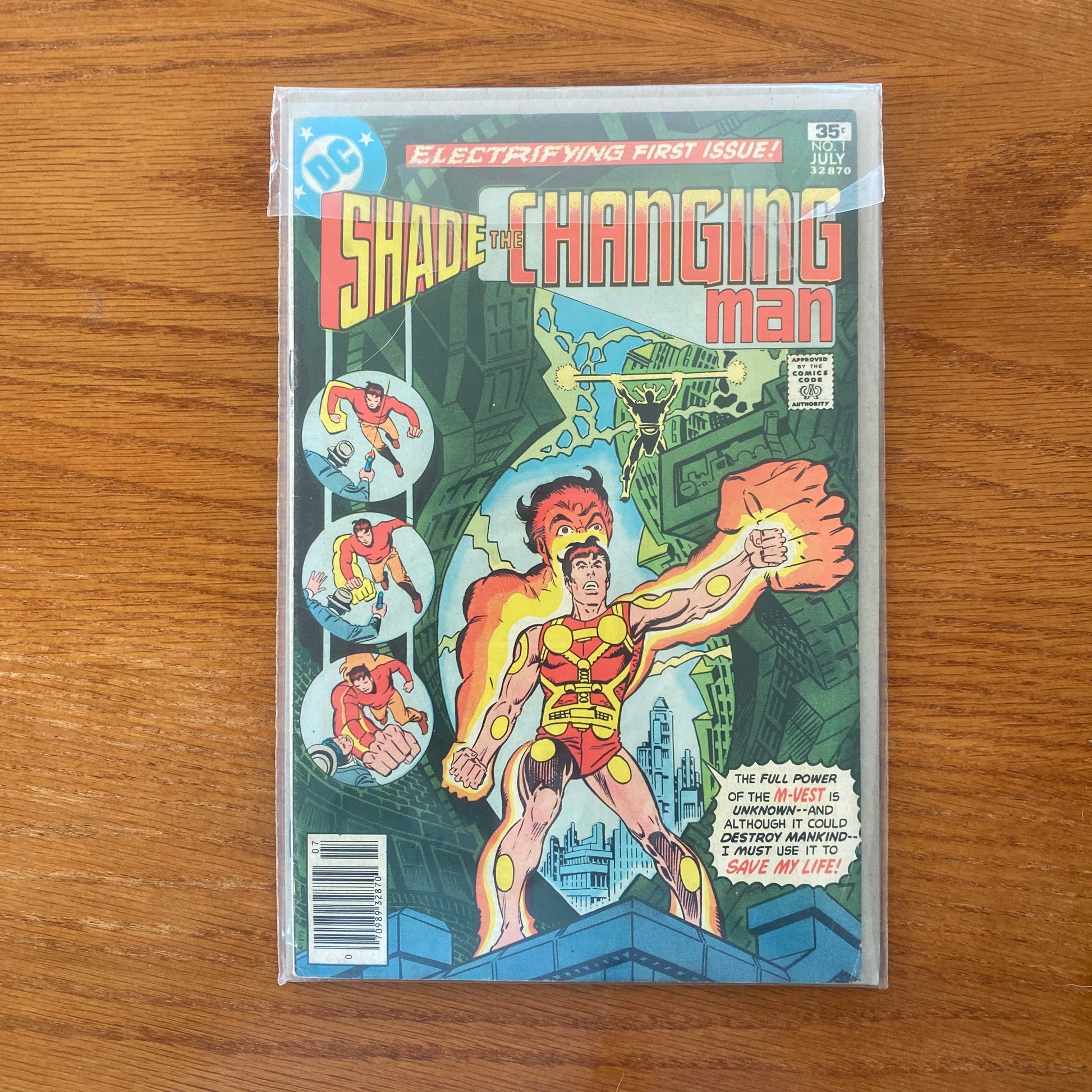 1st appearance of Shade, the Changing Man. Cover by Steve Ditko. Escape to Battleground Earth!, script by Steve Ditko and Michael Fleisher, art by Steve Ditko; Shade gets out of a prison in Meta, goes to Earth, and tries to clear his reputation—he claims innocence; With the help of his M-vest, he begins searching for Kempo; he also battles Zokag. First appearances of Mellu Loron, Crime council, The Form and Wizo. 36 pgs