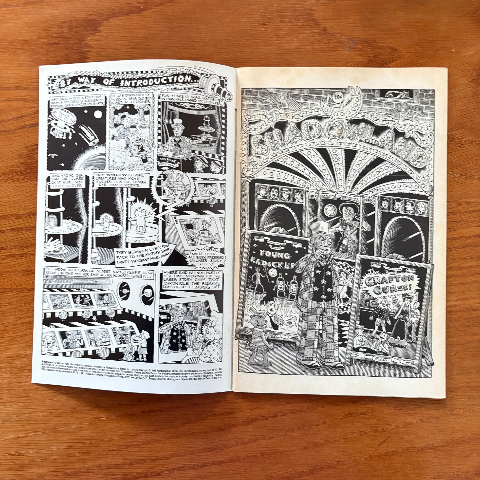 Shadowland #1 is a 24-page black-and-white comic by Kim Deitch, published by Fantagraphics in October 1989. This self-contained story, “The Victorian Alien Murder Mystery,” offers a blend of surrealism and satire, reflecting Deitch’s unique artistic style. With its color cover and saddle-stitched binding, this comic is a distinctive piece from the late 1980s alternative comics scene.