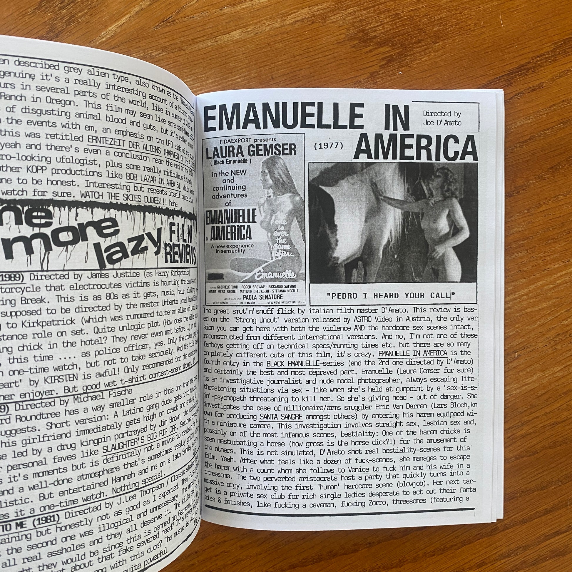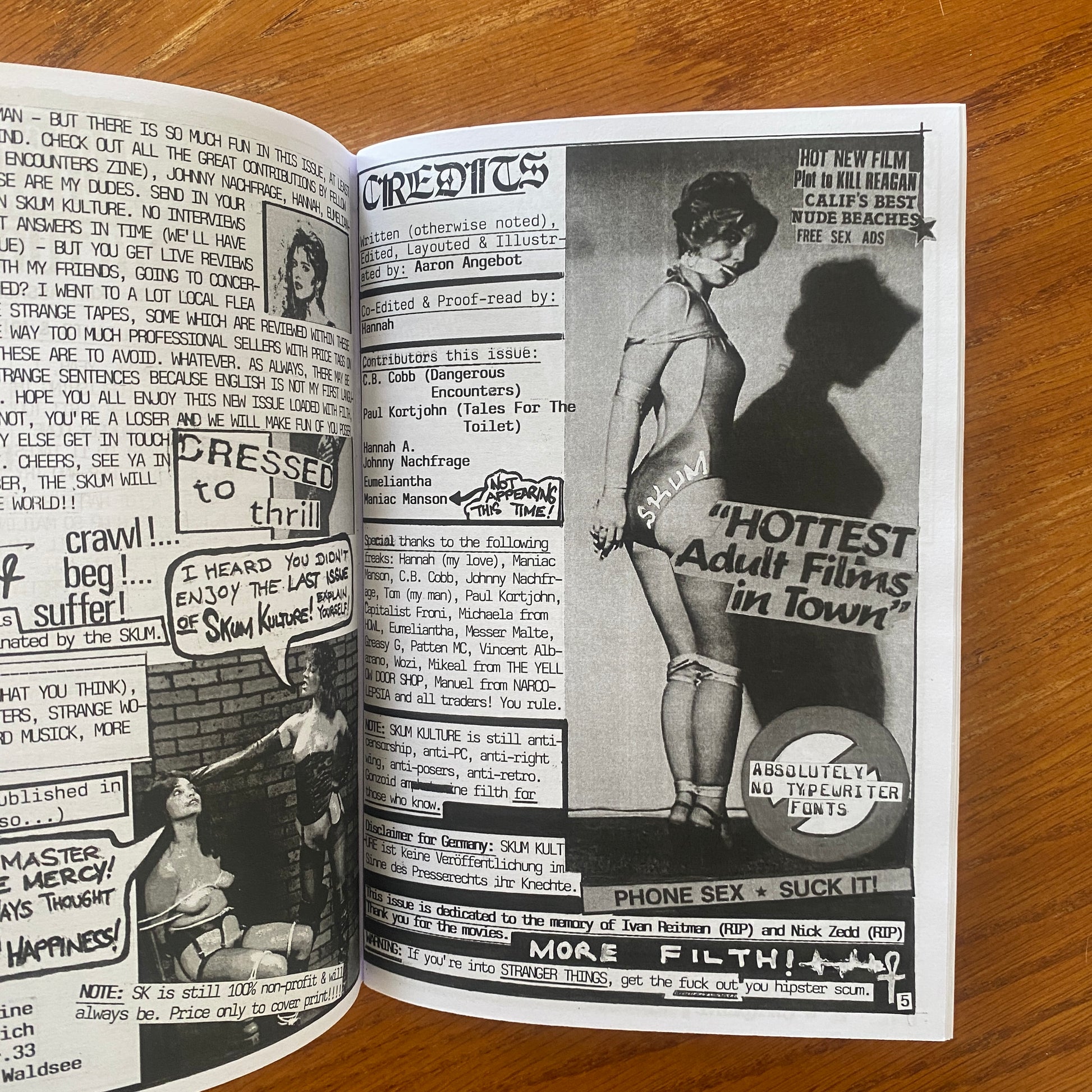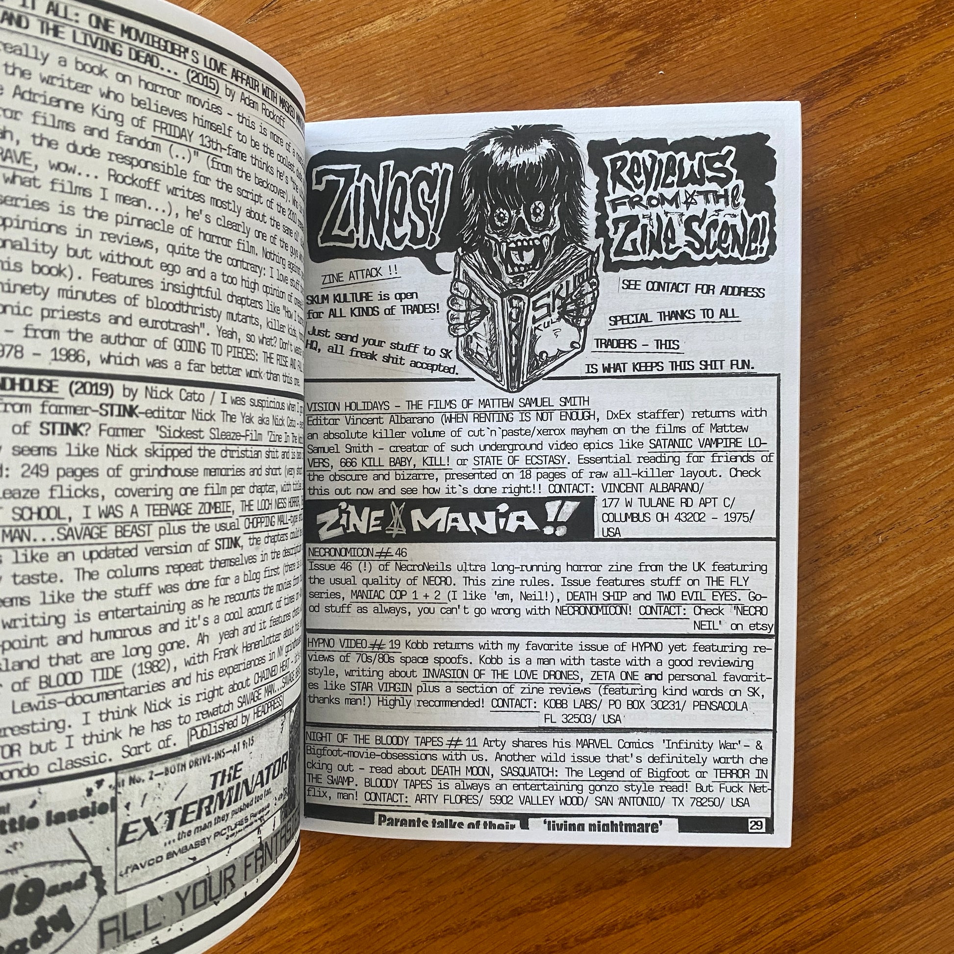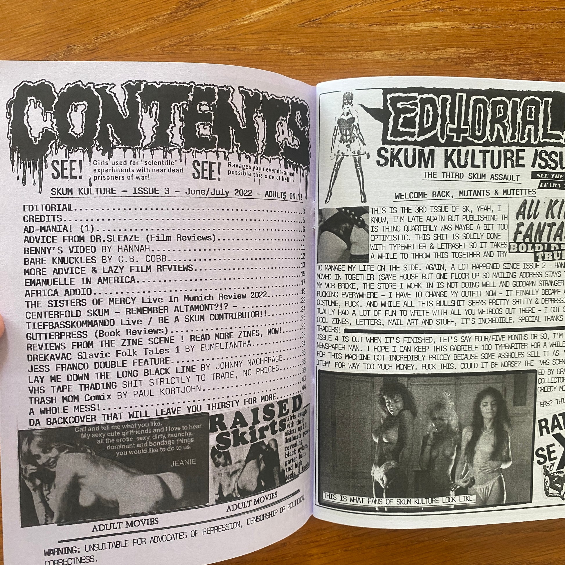 Skum Kulture is a raw and unapologetic A5 B&W xeroxed zine with a heavy focus on horror and sex in cinema, specifically exploitation cinema. Loads of film reviews and the occasional feature on a human or band. Pretty brutal at times.