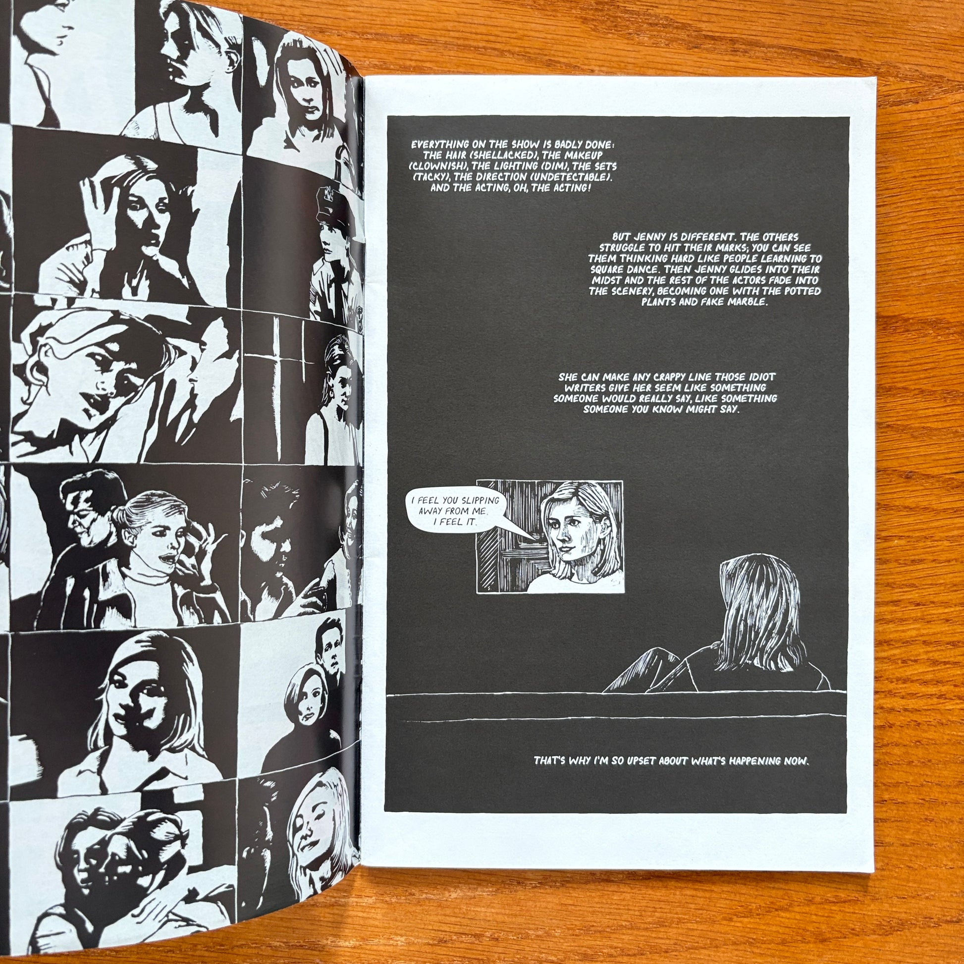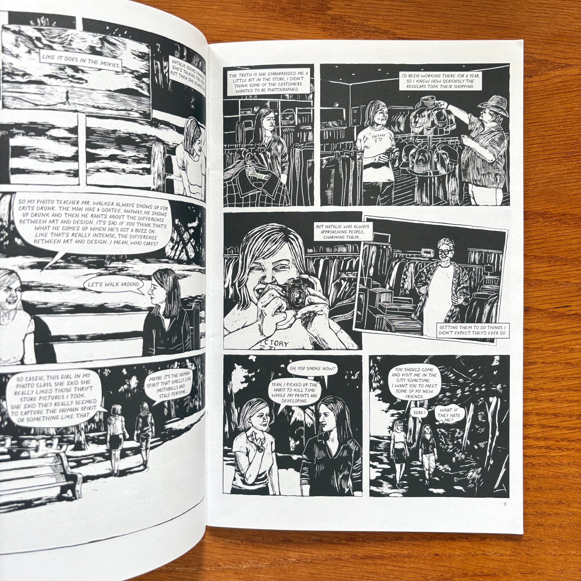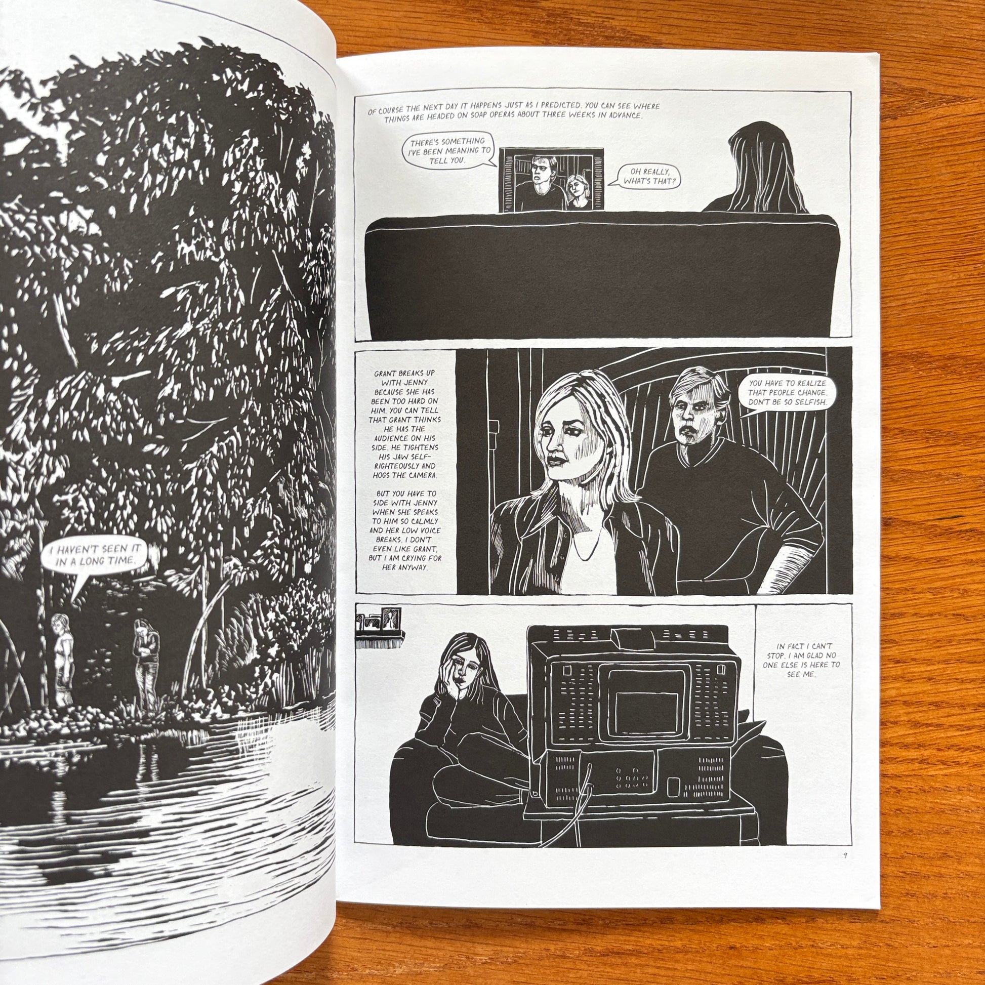 Drawn in dramatic scratchboard, Soap Opera tells the story of two friends who have begun to drift apart as they make the transition into adulthood. Outgoing Natalie heads off to her new life in the big city, and the lonesome Megan finds herself increasingly absorbed in the daytime serial that the two used to enjoy together. While acknowledging that reality can sometimes be more alienating than television, this coming of age tale finds beauty in the taking of an unexpected risk. 24 pages, B&W.