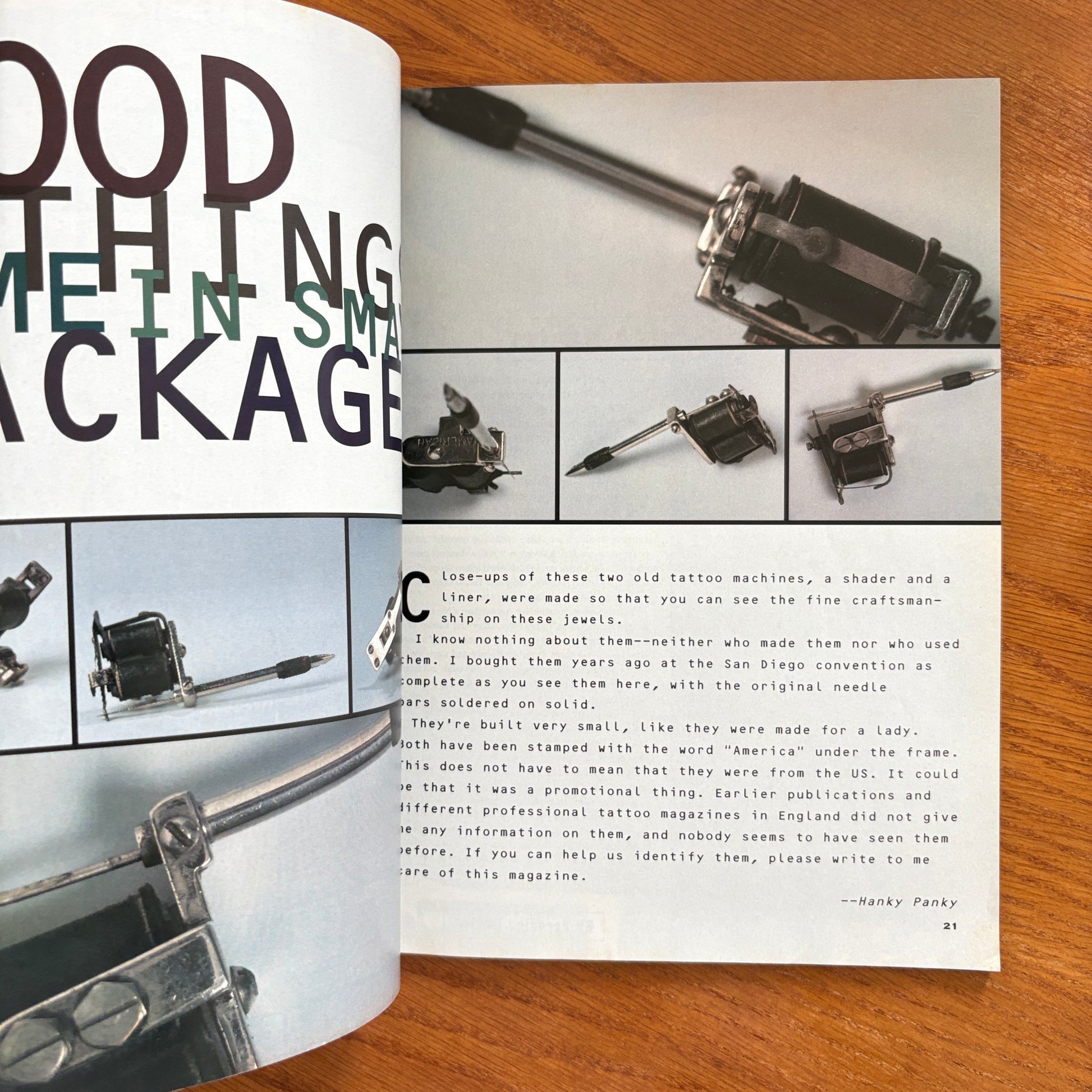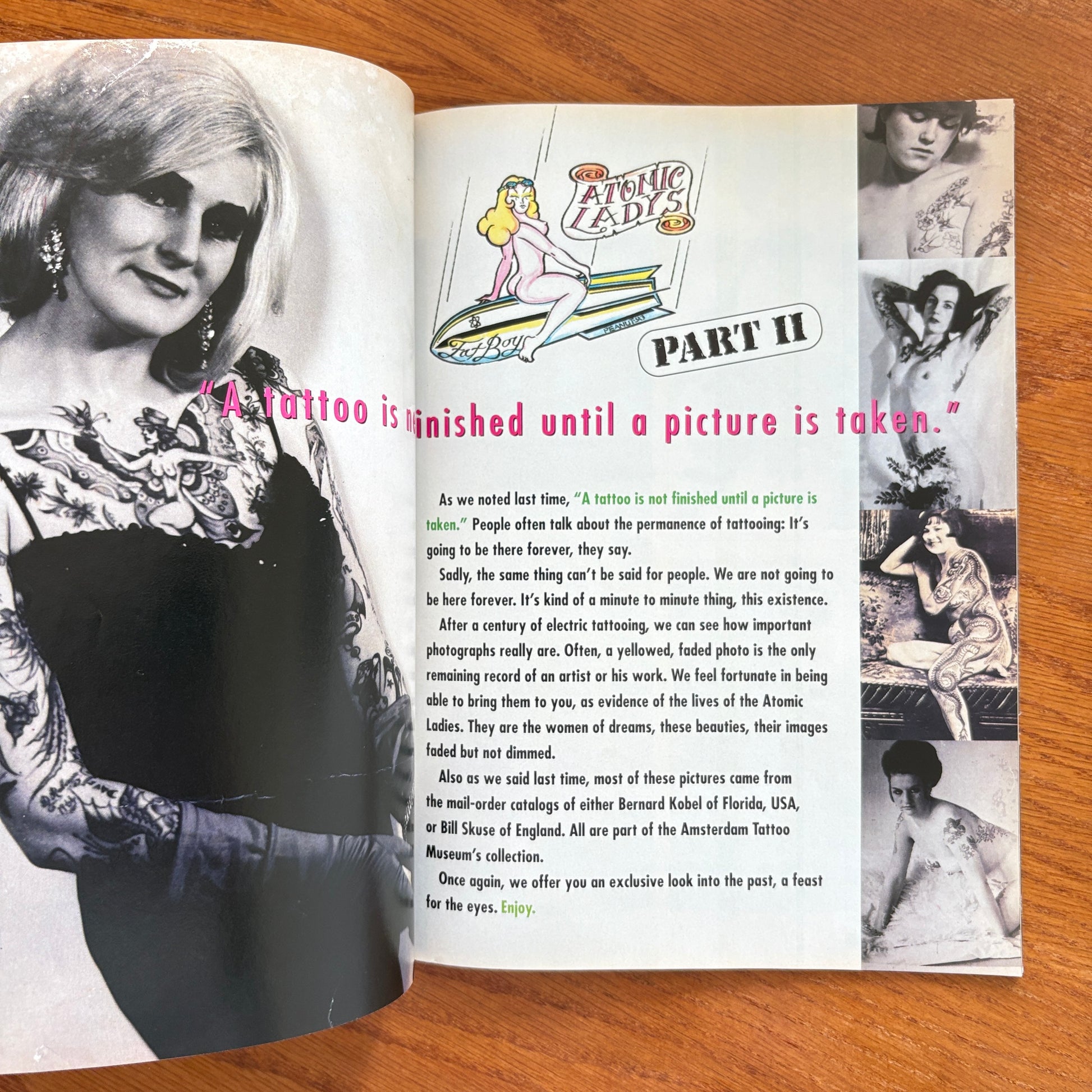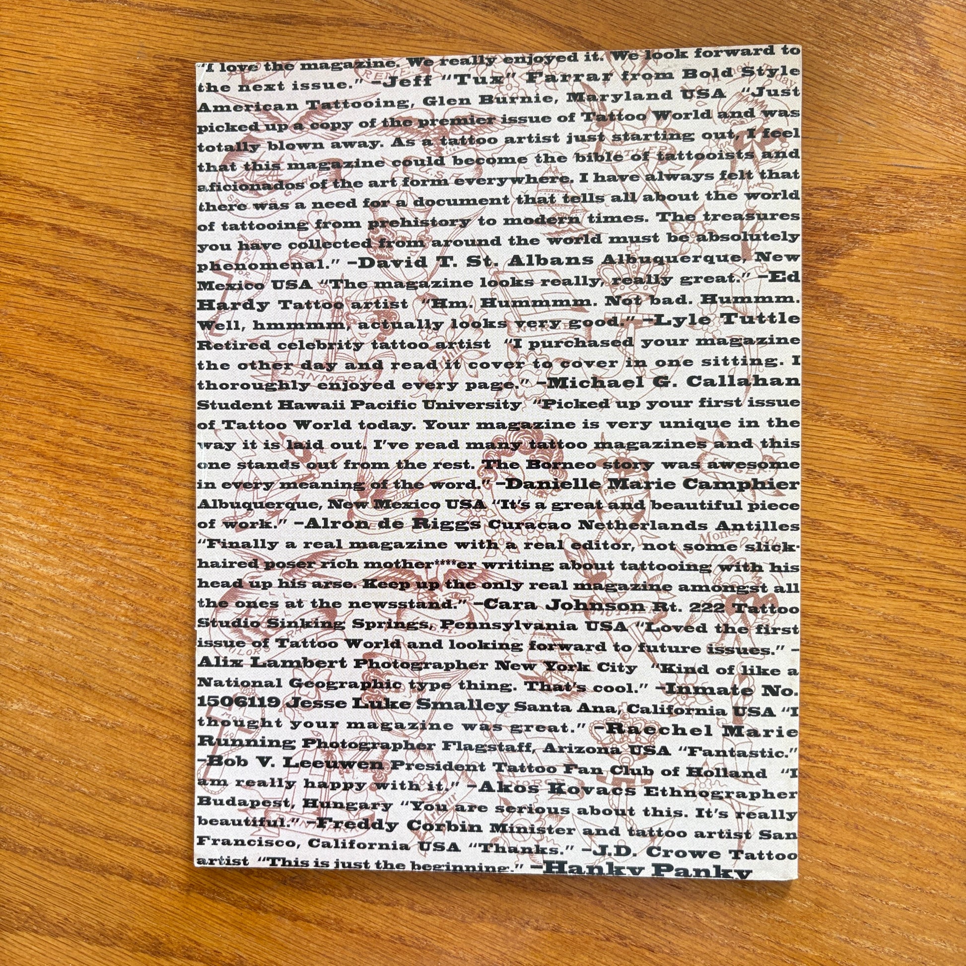 Tattoo World Vol. 1 No. 3 reads like a proper global tattoo history zine, mixing classic flash, old masters and odd archival finds. The issue opens with editorial notes and a call for reader submissions before diving into The Rose Tattoo and Good Things Come in Small Packages, both looking at iconic small-scale designs and how much meaning they can carry. A big chunk is devoted to Tattoo Peter: A Classic Dutch Master and a follow-up on Tattoo Machines by Tattoo Peter, framing him as a key European figure in both imagery and hardware. There’s a feature on Jack Irons, a Business Card Dossier: Brazil highlighting shops and artists from South America, plus pieces like What’s On a Man’s Mind, Ethnographic Illustrations and Atomic Ladies: Part Two, weaving in pin-up, anthropology and vintage illustration influences. Flash sections from Tattoo Jack, Bill Ward and Stoney sit alongside Shady Tattoo Men (& Three Women), an Interview with Horiwaka, and a photo of sideshow legend Captain Don Leslie, tying tattoo history, culture and ephemera together in one dense, archival-feeling issue.