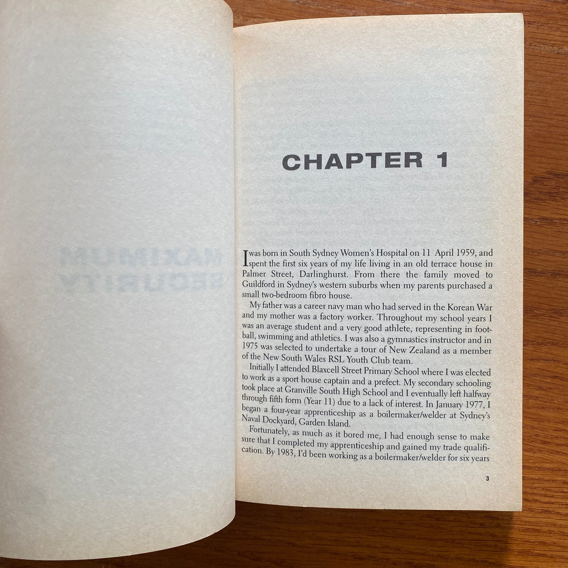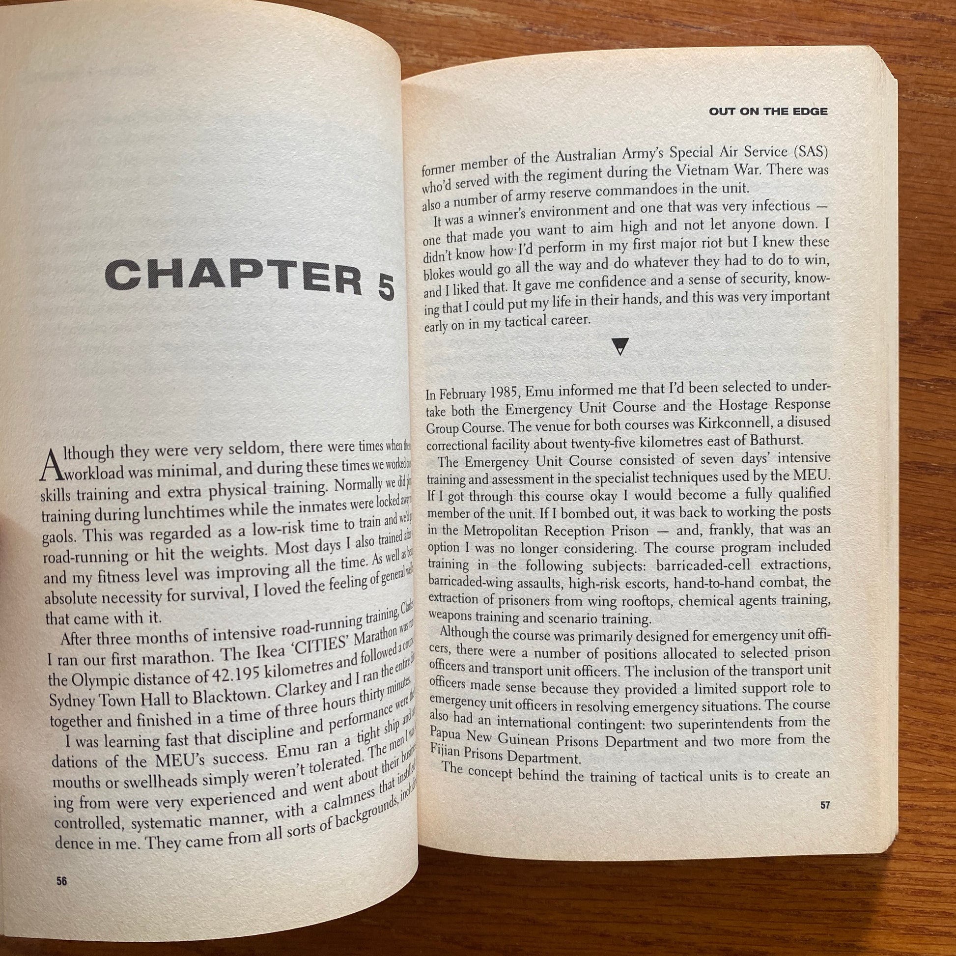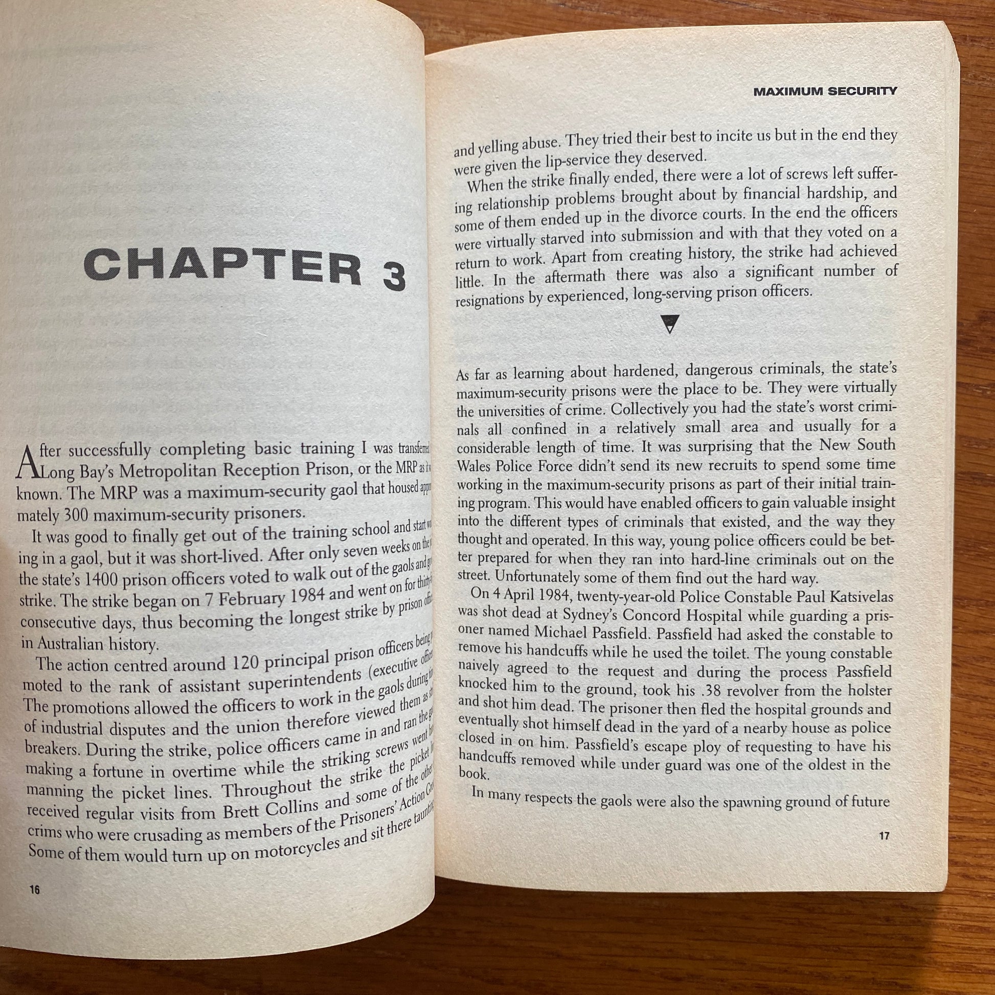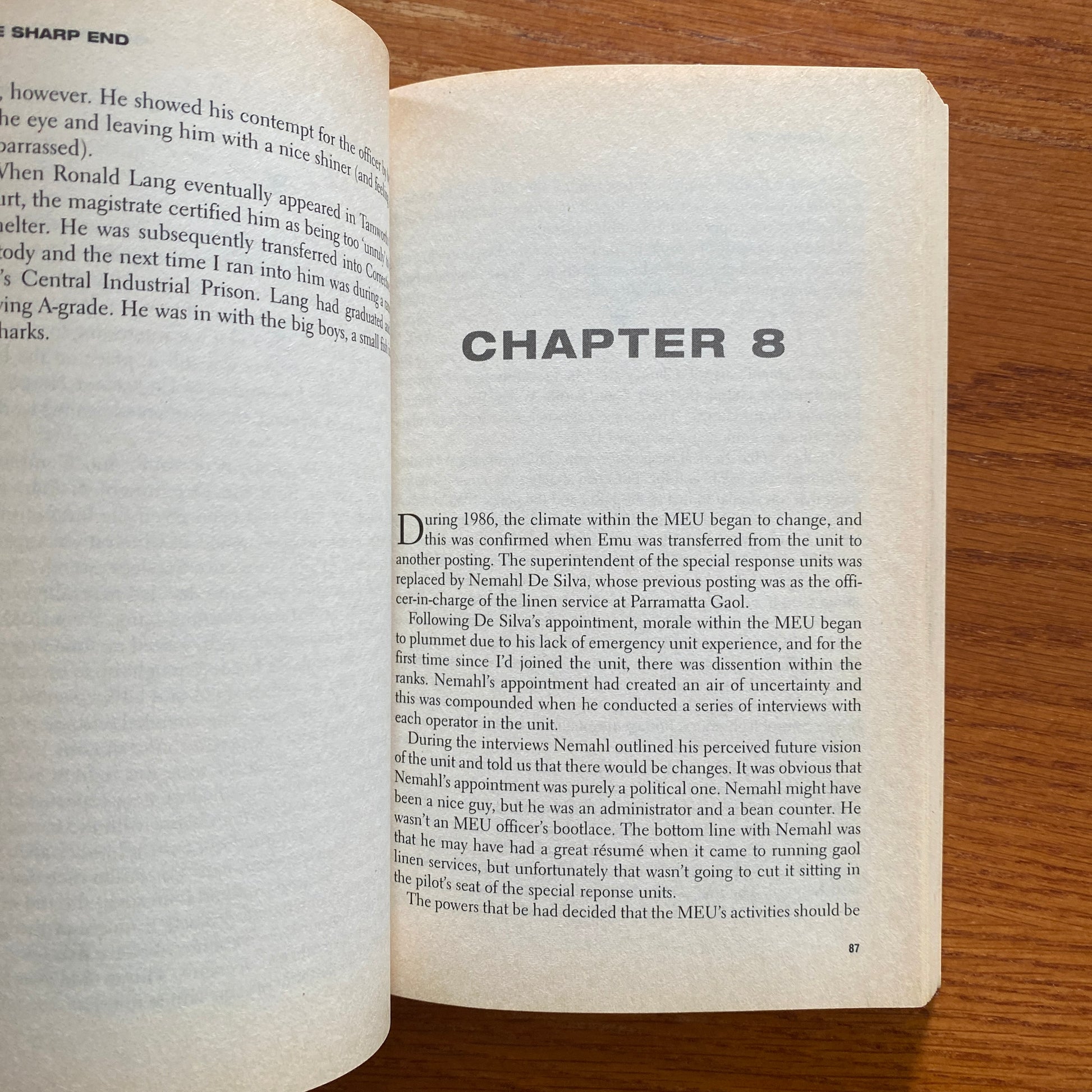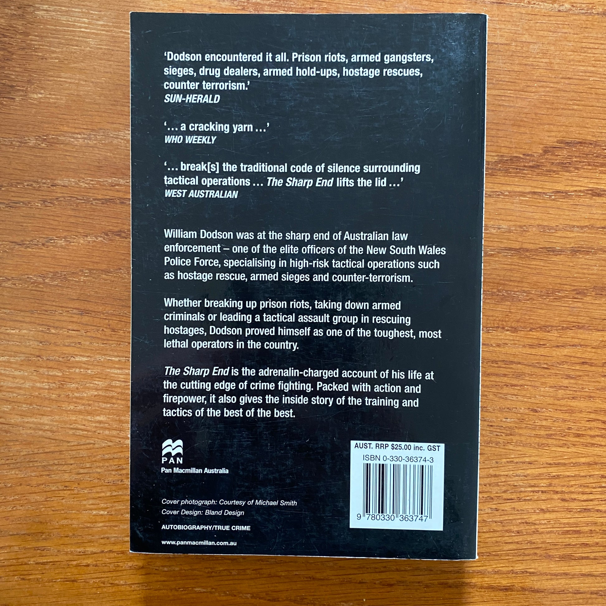 The Sharp End tells his story, from working as a prison officer in maximum security at Long Bay Gaol and overseeing some of the toughest crims in Australia, to his career in the Malabar Emergency Unit, the Hostage Response Group, the Tactical Response Group, and then in the elite State Protection Group, Tactical Operations Unit.