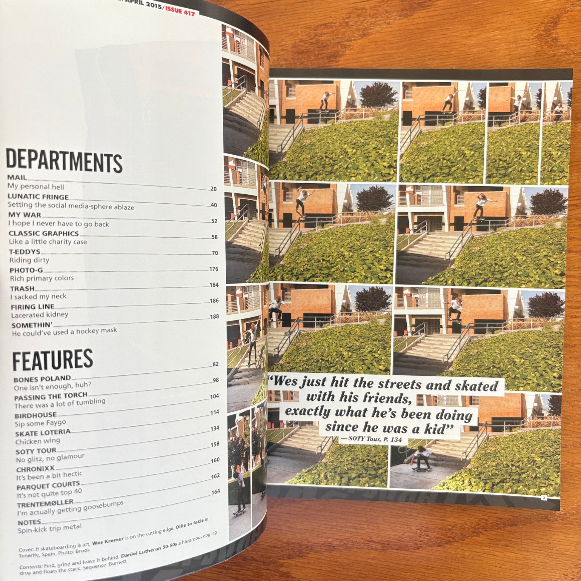 The departments reinforce the bruised realism. My War drops into personal hell, Lunatic Fringe lights up the social feeds, Photo-G splashes rich color across violence, and Trash catalogs neck sacks and kidney damage like badges of honor. The closing quote nails the spirit: Wes never stopped skating with his friends, never stopped pushing the streets the way he always has. No polish, no theater, just motion, impact, and progression grinding forward.