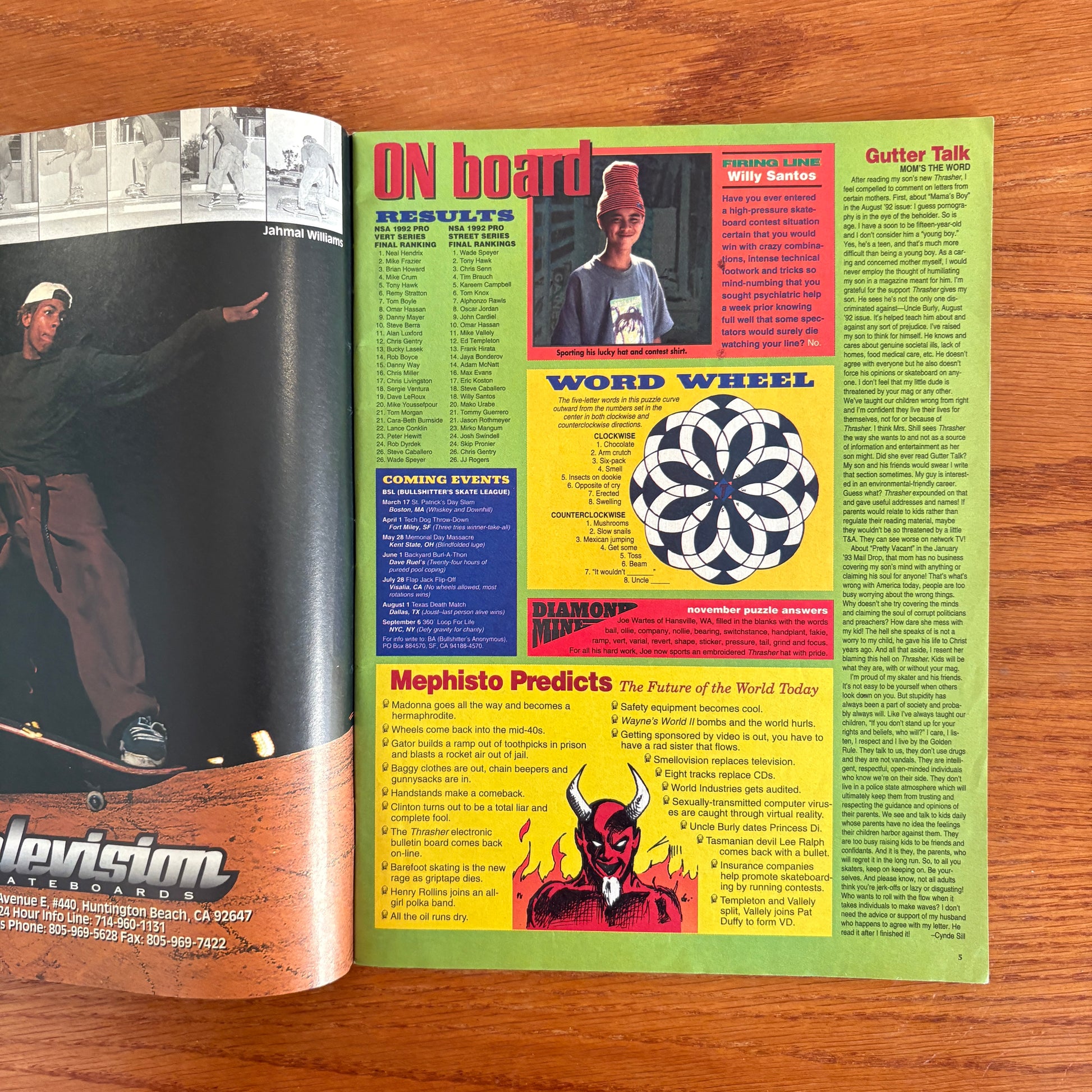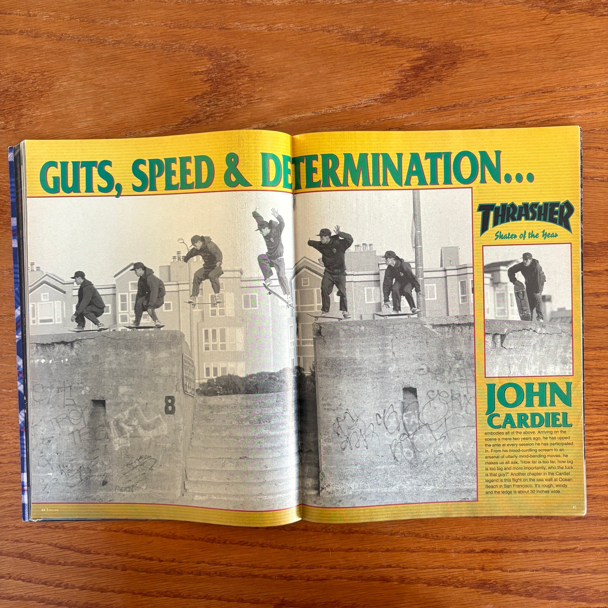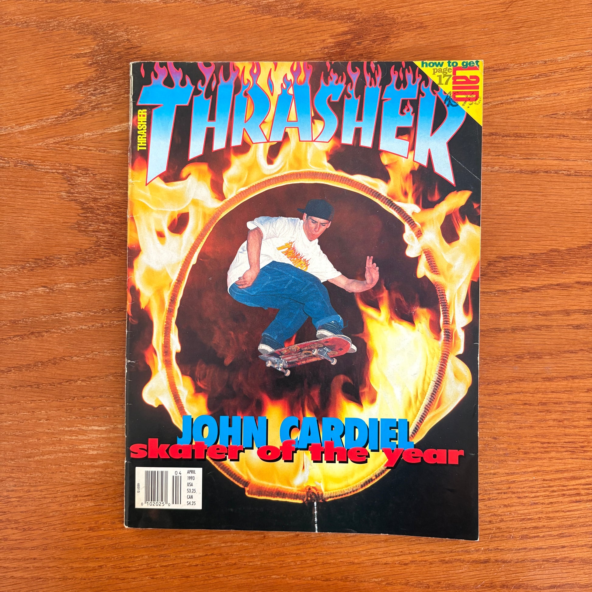 The April 1993 issue of Thrasher Magazine stands as a vibrant testament to the skateboarding culture of the early '90s. Gracing the cover is John Cardiel, captured mid-air in the iconic "Hoop of Fire" shot by Bryce Kanights—a fitting tribute to his recognition as Thrasher's 1992 Skater of the Year.