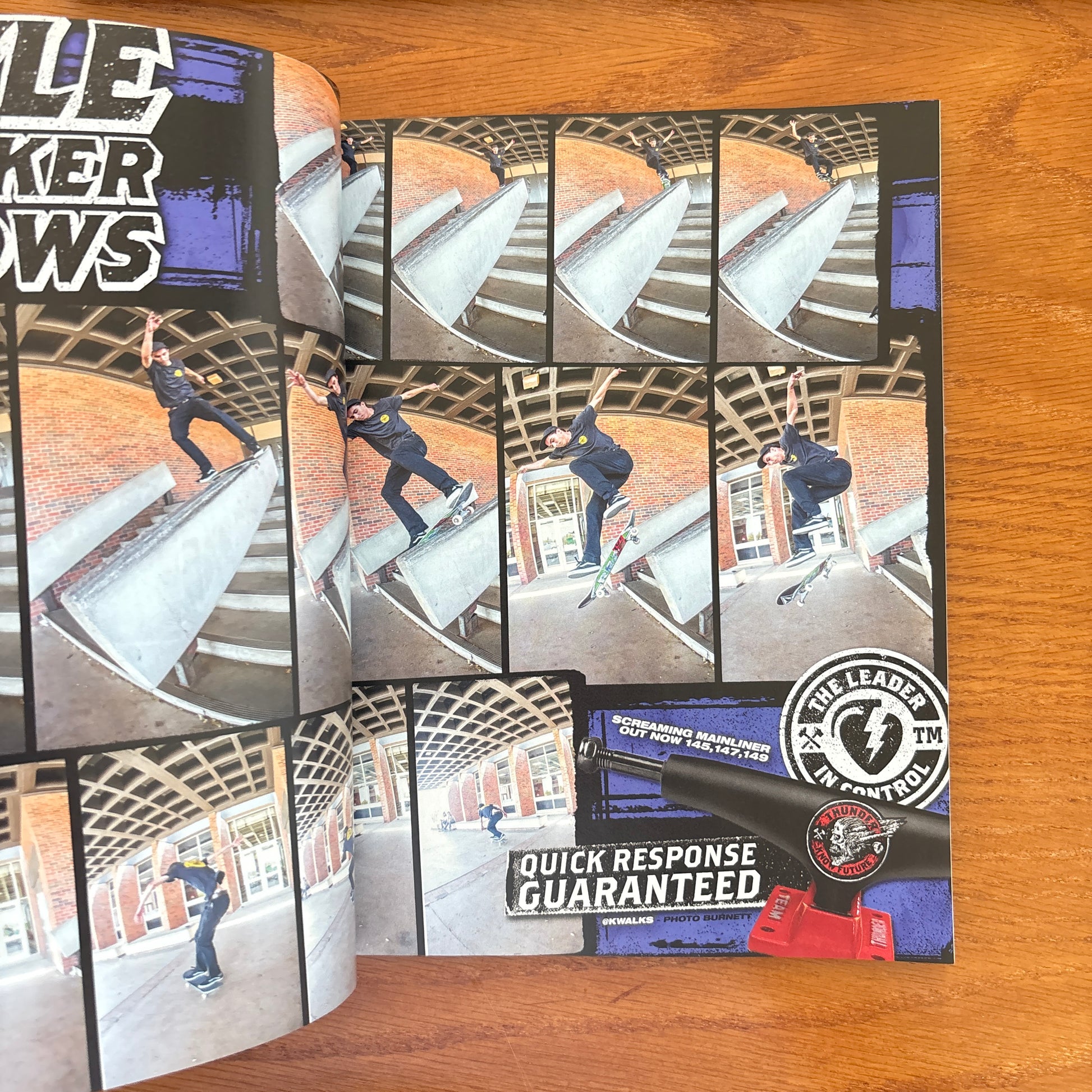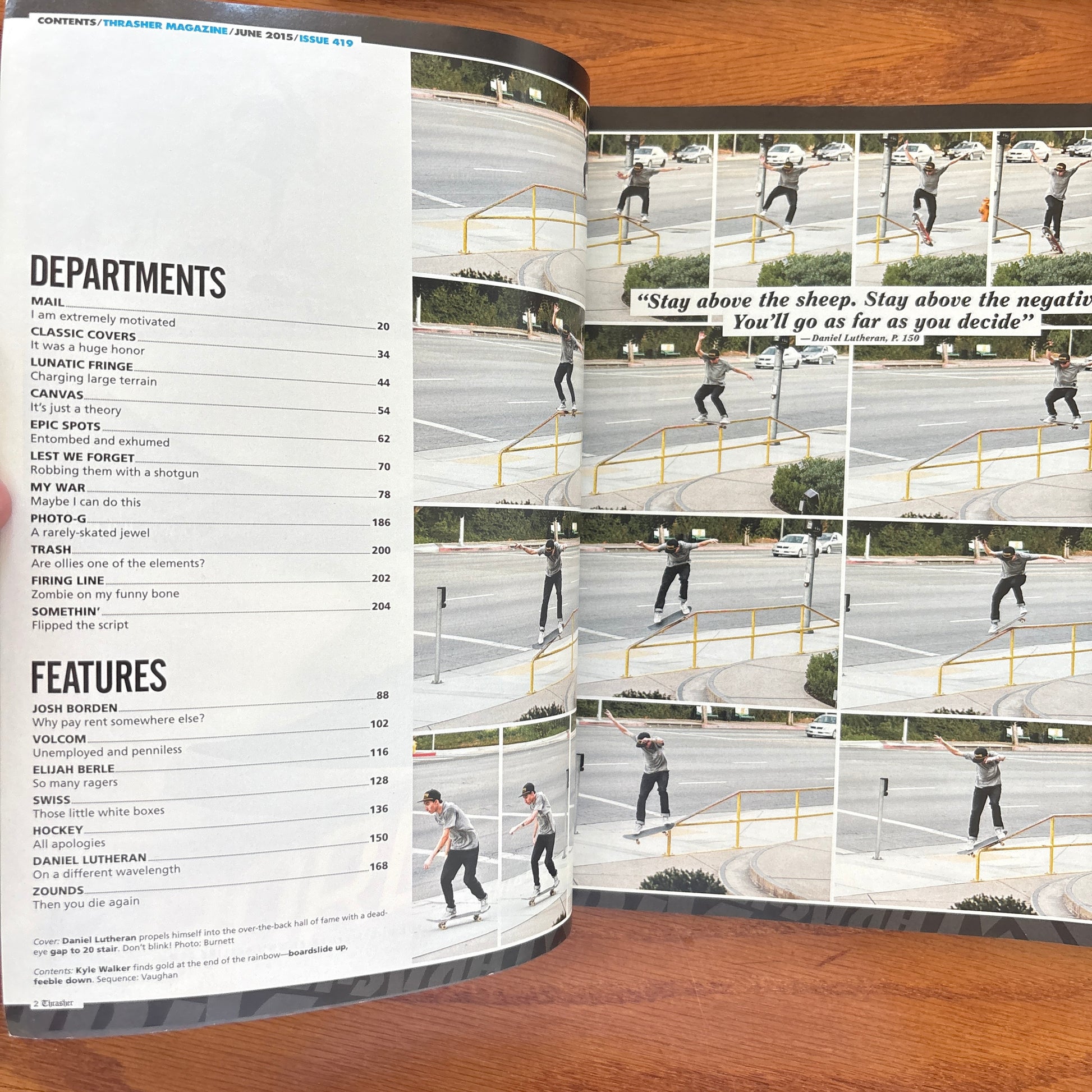 This issue is a full-throttle showcase of chaos, skill, and warped creativity, with Daniel Lutheran blasting into the cover shot—over-the-back deadeye gap to a 20-stair, pure commitment in motion. Features run the gamut from Josh Borden refusing to pay rent anywhere else, Elijah Berle surviving ragers, to Swiss navigating strange urban architecture, Hockey offering messy apologies, and Lutheran himself operating on a completely different wavelength. Departments feed the energy: Lunatic Fringe charges massive terrain, Epic Spots exhume hidden challenges, Trash questions whether ollies are elemental, and Photo-G captures rare, seldom-skated jewels. Zounds hits existential levels of destruction, Somethin’ flips the script, and Firing Line delivers gnarly, bone-jarring chaos. Kyle Walker chases rainbow-boardslides with feeble exits, while the overarching mantra—“Stay above the sheep. Stay above the negative. You’ll go as far as you decide”—cements this as an issue celebrating fearless skating, street wisdom, and pure adrenaline.