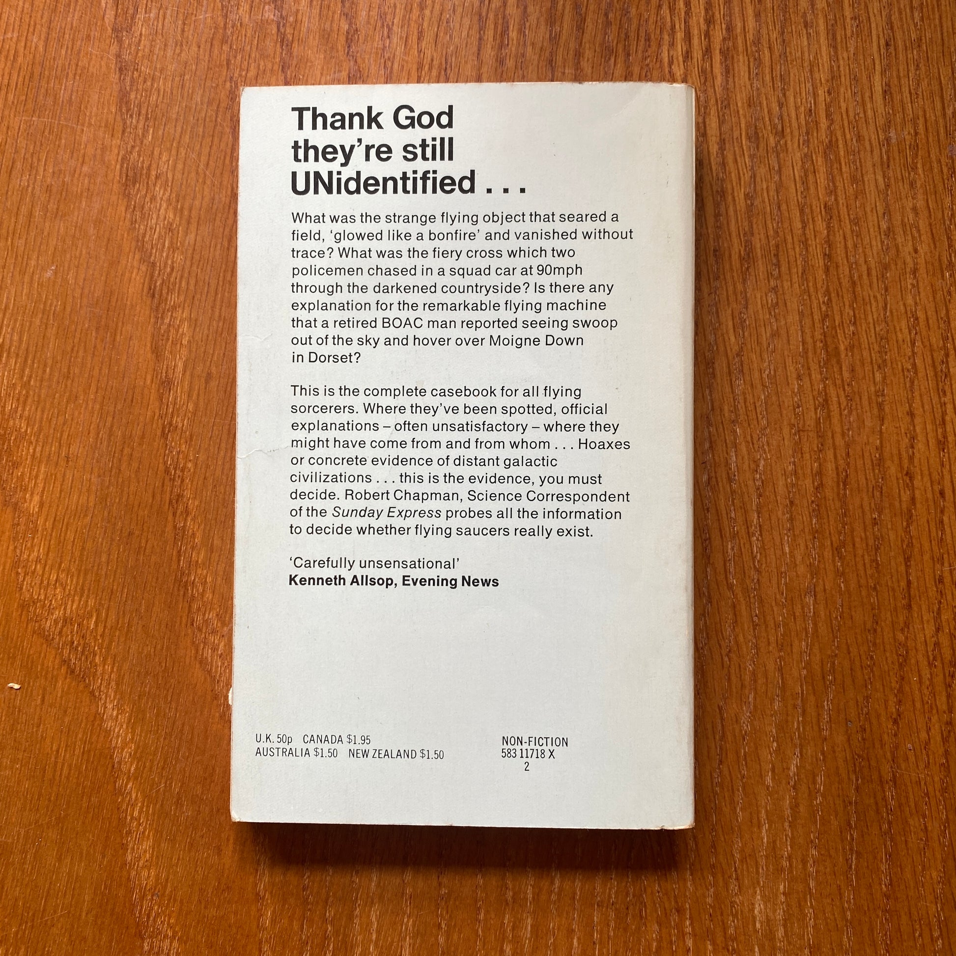 Where they've been spotted, official explanations - often unsatisfactory – where they might have come from and from whom ... Hoaxes or concrete evidence of distant galactic civilizations ... this is the evidence, you must decide. Robert Chapman, Science Correspondent of the Sunday Express probes all the information to decide whether flying saucers really exist.