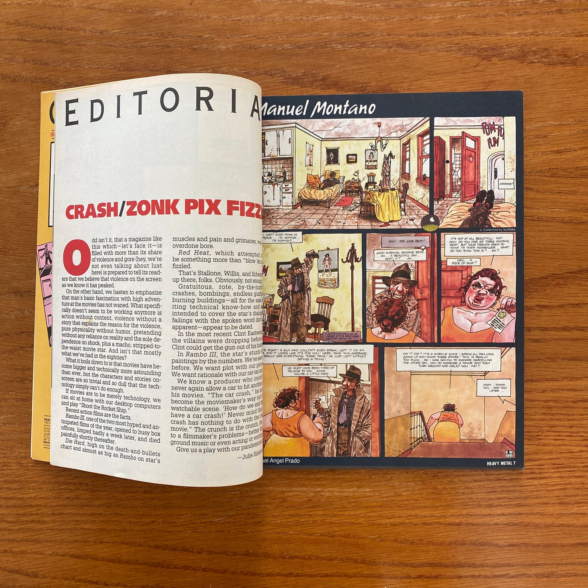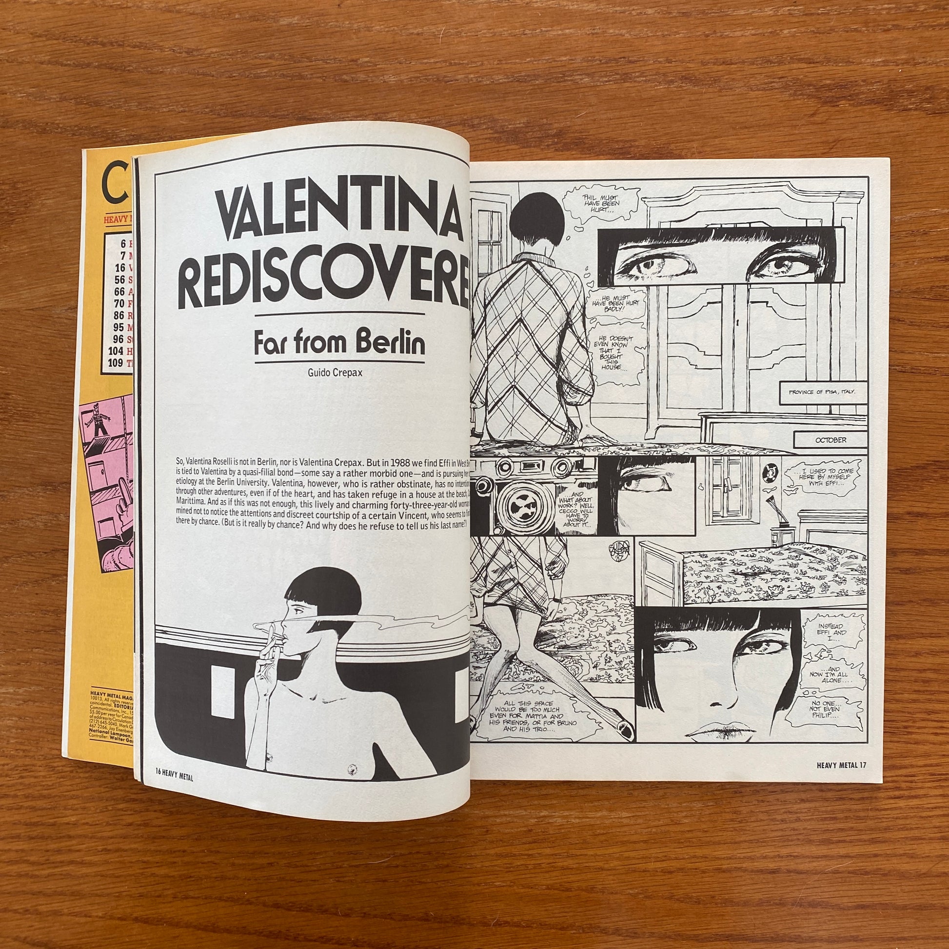 p.06 - "Editorial: Crash / Zonk Pix Fizzle" - Julie Simmons-Lynch p.07-14 - "Manuel Montano" - Miguelanxo "Miguel Angel" Prado p.15 - "Forgotten Films" - Drew Friedman p.16-53 - "Valentina Rediscovered: Far From Berlin" - Guido Crepax p.56-63 - "Stan The Alligator And The Underwater Army" - François Thomas p.66-68 - "Airhead" - Lou Stathis, Michael Uman, and James Fletcher p.70-84 - "Frank Cappa: Viet-Song: What The Hell Am I Doing Here?" - Manfred Sommer p.86-94 - "Red Tape" - Peter Kuper p.96-101 - "Stan Hoe: Dick At Large" - Stephen Hall p.104-107 - ""H"" - José María Beroy and Pascual Ferry p.109-112 - "The Stolen God" - Carlos Trillo and Fernando Rubio (reprinted in 15 Years Of 1992) |
