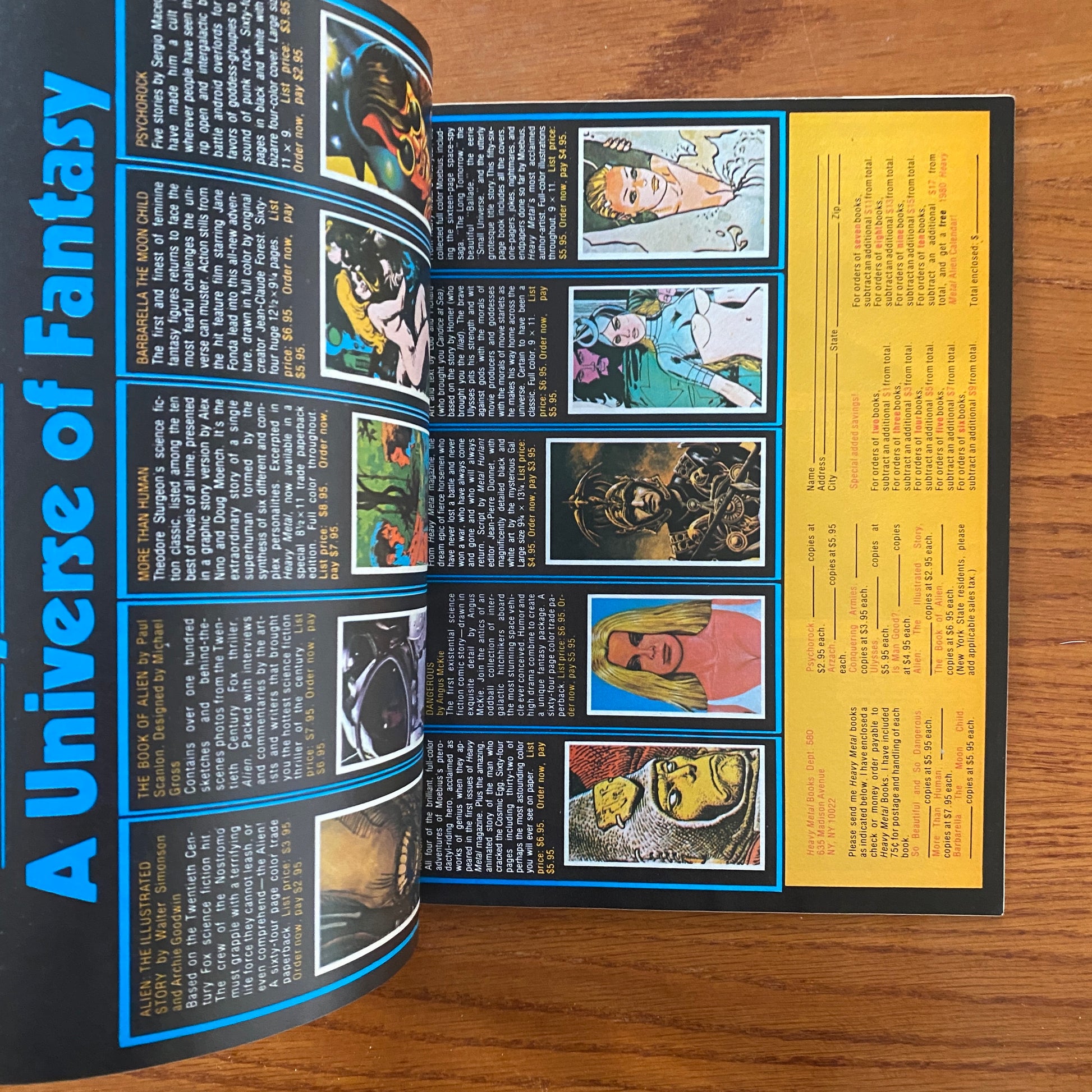 Illustrators like Luis Royo and Alex Ebel contributed artwork over the course of their careers. An adaptation of the film Alien named Alien: The Illustrated Story, written by Archie Goodwin and drawn by Walter Simonson, was published in the magazine in 1979.