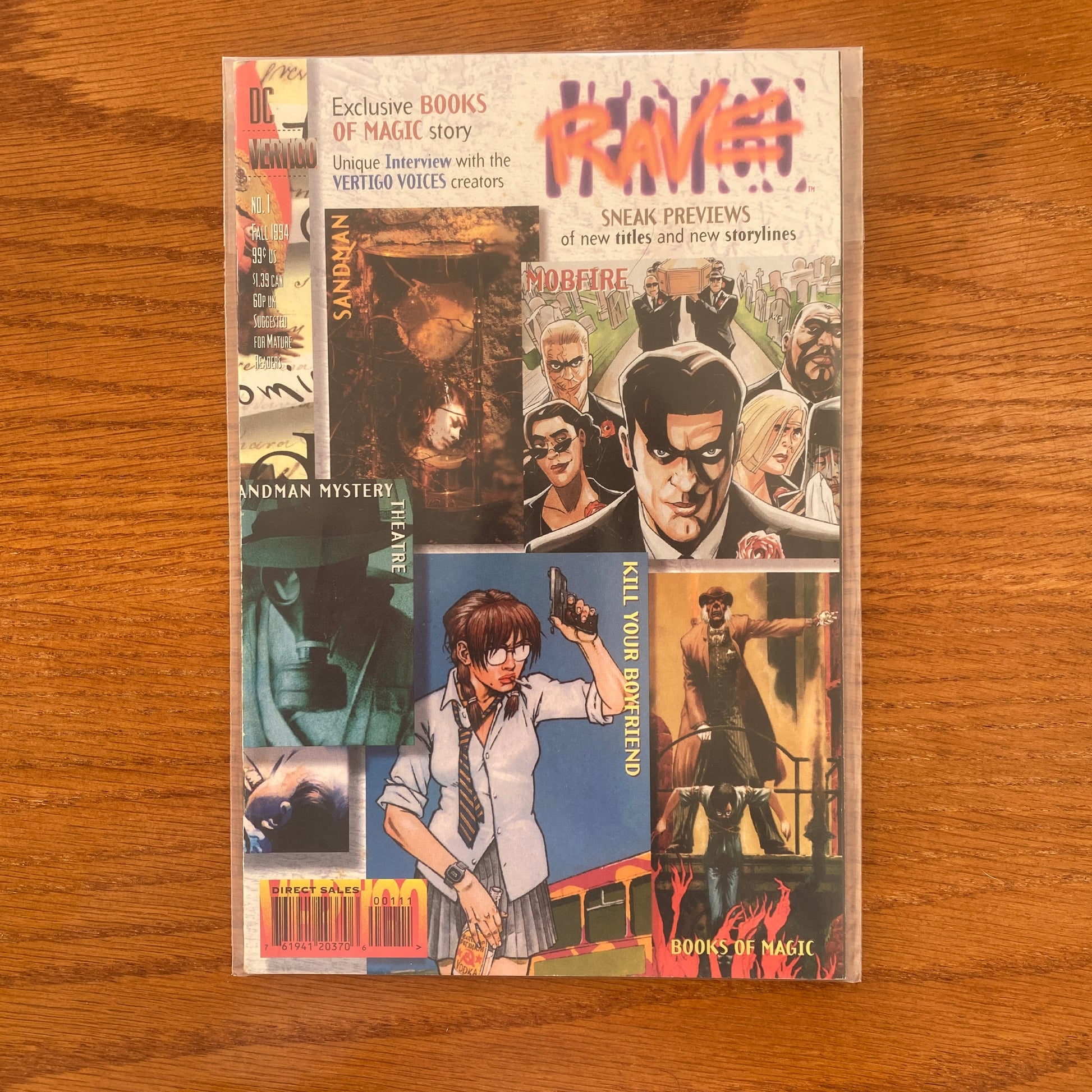 You won't need to pack a bag, hitch a ride or lose any sleep to enjoy VERTIGO RAVE, a tantalizing sampler of Vertigo projects! More than just a preview, this collection of Vertigo concepts features an exclusive BOOKS OF MAGIC story by John Ney Rieber, Gary Amaro and Dick Giordano. VERTIGO RAVE also provides a first look at VERTIGO VOICES, a new umbrella title of distinctive creator-driven one-shots, including one-of-a-kind interviews with creators. Here are the first looks at KILL YOUR BOYFRIEND, FACE, TAINTED and BIZARRE BOYS. And to make sure you stay all night, VERTIGO RAVE offers previews of new series such as MOBFIRE and SHADOWS FALL, as well as scenes from issues of THE INVISIBLES, THE SANDMAN, SANDMAN MYSTERY THEATRE and more. No ads. Suggested for Mature Readers.